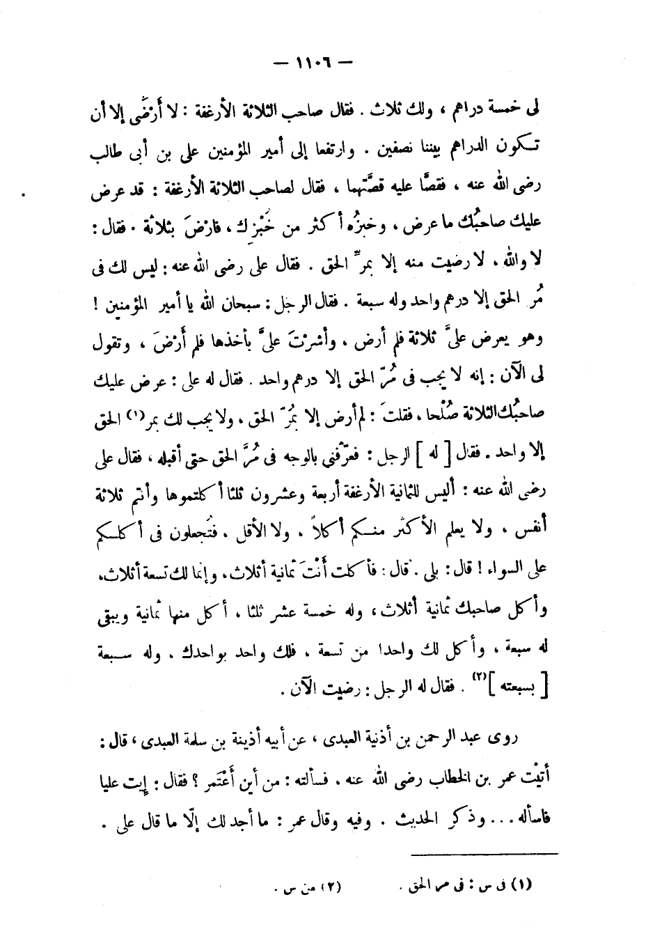 لا والله، لا رضيت منه إلا بمر الحق، فقال علي رَضِيَ اللَّهُ عَنْهُ: ليس لك فِي مر الحق إلا درهم واحد وله سبعة. فقال الرجل: سبحان الله يَا أمير المؤمنين! وَهُوَ يعرض علي ثلاثة فلم أرض، وأشرت علي بأخذها فلم أرض، وتقول لي الآن: إنه لا يجب فِي مر الحق إلا درهم واحد. فَقَالَ لَهُ علي: عرض عليك صاحبك الثلاثة صلحا، فقلت: لم أرض إلا بمر الحق، ولا يجب لك بمر [١] الحق إلا واحد. فقال [لَهُ] الرجل: فعرفني بالوجه فِي مر الحق حَتَّى أقبله، فَقَالَ علي رَضِيَ اللَّهُ عَنْهُ: أليس للثمانية الأرغفة أربعة وعشرون ثلثا أكلتموها وأنتم ثلاثة أنفس، ولا يعلم الأكثر منكم أكلا، ولا الأقل، فتجعلون فِي أكلكم على السواء! قَالَ: بلى. قال: فأكلت أنت ثمانية أثلاث، وإنما لك تسعة أثلاث، وأكل صاحبك ثمانية أثلاثٍ، وله خمسة عشر ثلثا، أكل منها ثمانية ويبقى لَهُ سبعة، وأكل لك واحدا من تسعة، فلك واحد بواحدك، وله سبعة [بسبعته] [٢] . فقال لَهُ الرجل: رضيت الآن. روى عَبْد الرَّحْمَنِ بْن أذينة العبديّ، عن أبيه أذينة بْن سَلَمَة العبدي، قَالَ: