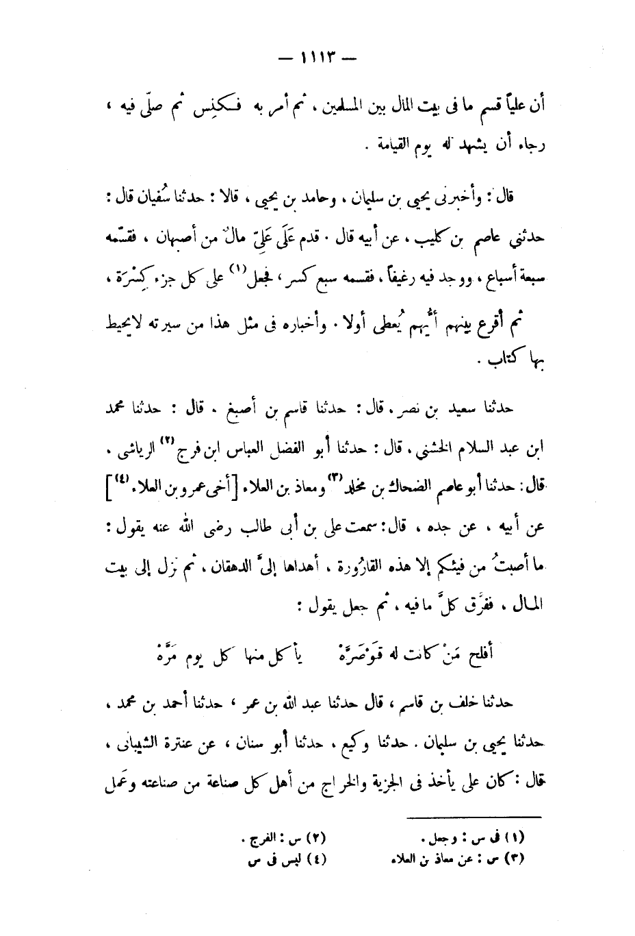 حَدَّثَنَا سَعِيدُ بْنُ نَصْرٍ، قَالَ: حَدَّثَنَا قاسم بن أصبغ، قال: حدثنا محمد ابن عَبْدِ السَّلامِ الْخُشَنِيُّ، قَالَ: حَدَّثَنَا أَبُو الْفَضْلِ العباس ابن فَرَجٍ [٢] الرِّيَاشِيُّ، قَالَ: حَدَّثَنَا أَبُو عَاصِمٍ الضَّحَّاكُ بن مخلد [٣] ومعاذ بن العلاء [أخى عَمْرِو بْنِ الْعَلاءِ [٤]] عَنْ أَبِيهِ، عَنْ جَدِّهِ، قَالَ: سَمِعْتُ عَلِيَّ بْنَ أَبِي طَالِبٍ رَضِيَ اللَّهُ عَنْهُ يَقُولُ: