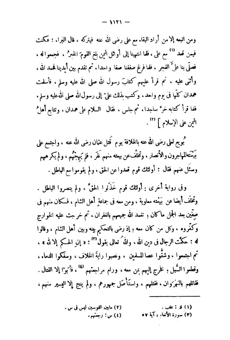 وَمَنِ اتَّبَعَهُ إِلا مَنْ أَرَادَ الْبَقَاءَ مَعَ عَلِيٍّ رَضِيَ اللَّهُ عَنْهُ فَيَتْرُكُهُ، قَالَ الْبَرَاءُ: فَكُنْتُ فِيمَنْ قَعَدَ [١] مَعَ عَلِيٍّ، فَلَمَّا انْتَهَيْنَا إِلَى أَوَائِلِ الْيَمَنِ بَلَغَ الْقَوْمَ الْخَبَرُ، فَجُمِعُوا لَهُ، فَصَلَّى بِنَا عَلِيٌّ الْفَجْرَ، فَلَمَّا فَرِغَ صَفَفْنَا صَفًّا وَاحِدًا، ثُمَّ تَقَدَّمَ بَيْنَ أَيْدِينَا فَحَمِدَ اللَّهَ، وَأَثْنَى عَلَيْهِ، ثُمَّ قَرَأَ عَلَيْهِمْ كتاب رسول الله صلى الله عليه وسلم، فَأَسْلَمَتْ هَمْدَانُ كُلُّهَا فِي يَوْمٍ وَاحِدٍ، وَكَتَبَ بِذَلِكَ عَلِيٌّ إِلَى رَسُولِ اللَّهِ صَلَّى اللَّهُ عَلَيْهِ وَسَلَّمَ، فَلَمَّا قَرَأَ كِتَابَهُ خَرَّ سَاجِدًا، ثُمَّ جَلَسَ، فَقَالَ السَّلامُ عَلَى هَمْدَانَ، وَتَتَابَعَ أَهْلُ الْيَمَنِ عَلَى الإِسْلامِ] [٢] . بويع لعلي رَضِيَ اللَّهُ عَنْهُ بالخلافة يَوْم قتل عُثْمَان رَضِيَ اللَّهُ عَنْهُ، واجتمع على بيعته المهاجرون والأنصار، وتخلف عَنْ بيعته منهم نفر، فلم يهجهم، ولم يكرههم وسئل عنهم فَقَالَ: أولئك قوم قعدوا عَنِ الحق، ولم يقوموا مع الباطل. وفي رواية أخرى: أولئك قوم خذلوا الحق، ولم ينصروا الباطل. وتخلف أيضا عَنْ بيعته مُعَاوِيَة، ومن معه فِي جماعة أهل الشام، فكان منهم فِي صفين بعد الجمل مَا كَانَ، تغمد الله جميعهم بالغفران، ثُمَّ خرجت عَلَيْهِ الخوارج وكفروه، وكل من كَانَ معه، إذ رضي بالتحكيم بينه وبين أهل الشام، وقالوا لَهُ: حكمت الرجال فِي دين الله، والله تعالى يَقُول [٣] : إِنِ الْحُكْمُ إِلَّا لِلَّهِ ٦: ٥٧، ثم اجتمعوا، وشقوا عصا المسلمين، ونصبوا راية الخلاف، وسفكوا الدماء، وقطعوا السبل، فخرج إليهم بمن معه، ورام مراجعتهم [٤] ، فأبوا إلا القتال.