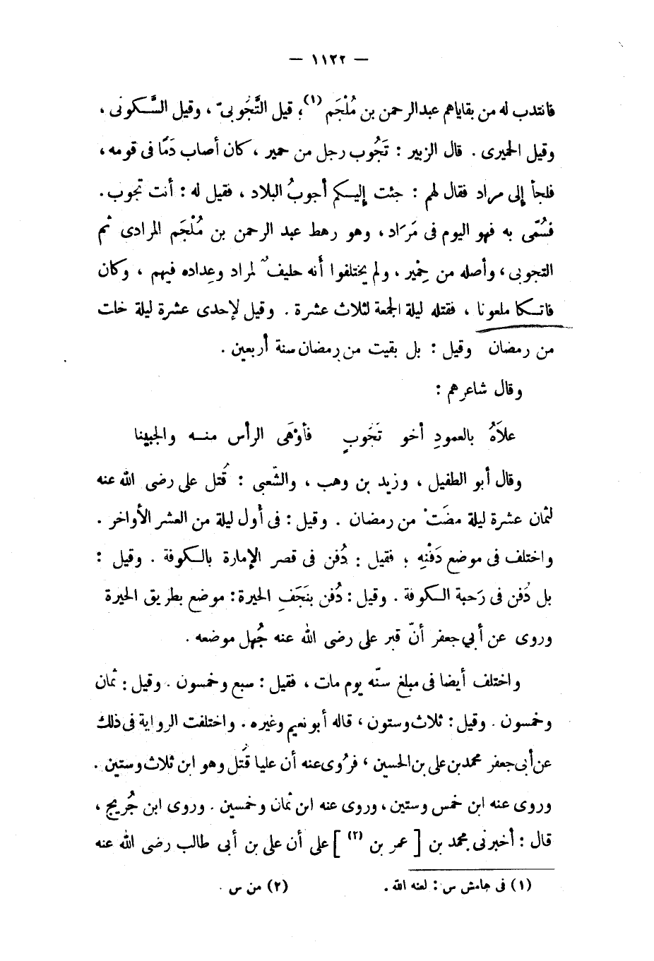 فسمي بِهِ فهو اليوم في مراد، وهو رهط بعد الرَّحْمَنِ بْن ملجم المرادي ثُمَّ التجوبي، وأصله من حمير، ولم يختلفوا أَنَّهُ حليف لمراد وعداده فيهم، وَكَانَ فاتكا ملعونا، فقتله ليلة الجمعة لثلاث عشرة. وقيل لإحدى عشرة ليلة خلت من رمضان وقيل: بل بقيت من رمضان سنة أربعين.