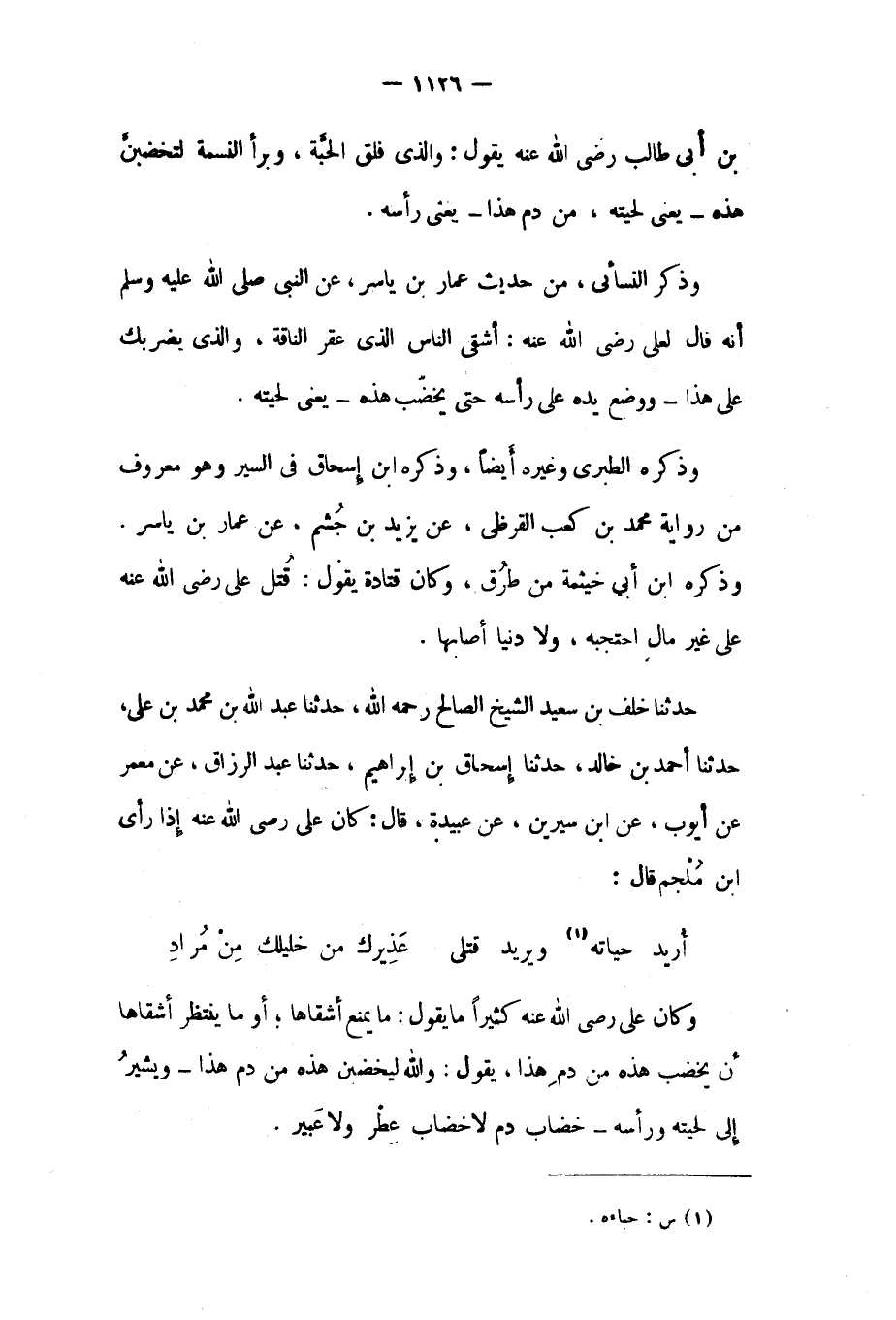 وكان علي رَضِيَ اللَّهُ عَنْهُ كثيرا مَا يَقُول: مَا يمنع أشقاها، أو مَا ينتظر أشقاها أن يخضب هَذِهِ من دم هذا، يقول: والله ليخضبن هَذِهِ من دم هَذَا- ويشير إِلَى لحيته ورأسه- خضاب دم لا خضاب عطر ولا عبير.