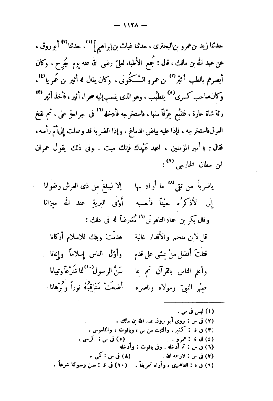 حدثنا زيد بن عمرو بن البختري، حَدَّثَنَا غِيَاثُ بْنُ إِبْرَاهِيمَ] [١] ، حَدَّثَنَا [٢] أَبُو رَوْقٍ، عَنْ عَبْدِ اللَّهِ بْنِ مَالِكٍ، قَالَ: جُمِعَ الأَطِبَّاءُ لِعَلِيٍّ رَضِيَ اللَّهُ عَنْهُ يَوْمَ جُرِحَ، وَكَانَ أَبْصَرُهُمْ بِالطِّبِّ أَثِيرُ [٣] بْنُ عَمْرٍو السَّكُونِيُّ، وَكَانَ يُقَالُ لَهُ أَثِيرُ بْنُ عُمْرِيَا [٤] ، وَكَانَ صَاحِبُ كِسْرَى [٥] يَتَطَبَّبُ، وَهُوَ الَّذِي يُنْسَبُ إِلَيْهِ صَحَرَاءُ أَثِيرٍ، فَأَخَذَ أَثِيرُ [٣] رِئَةَ شَاةٍ حَارَّةٍ، فَتَتَبَّعَ عِرْقًا مِنْهَا، فَاسْتَخْرَجَهُ فَأَدْخَلَهُ [٦] فِي جِرَاحَةِ عَلِيٍّ، ثُمَّ نَفَخَ الْعِرْقَ فَاسْتَخْرَجَهُ، فَإِذَا عَلَيْهِ بَيَاضُ الدِّمَاغِ، وَإِذَا الضَّرْبَةُ قَدْ وَصَلَتْ إِلَى أُمِّ رَأْسِهِ، فَقَالَ: يَا أَمِيرَ الْمُؤْمِنِينَ، اعْهَدْ عَهْدِكَ فَإِنَّكَ مَيِّتٌ. وفي ذَلِكَ يَقُول عِمْرَان ابن حطان الخارجي [٧] :