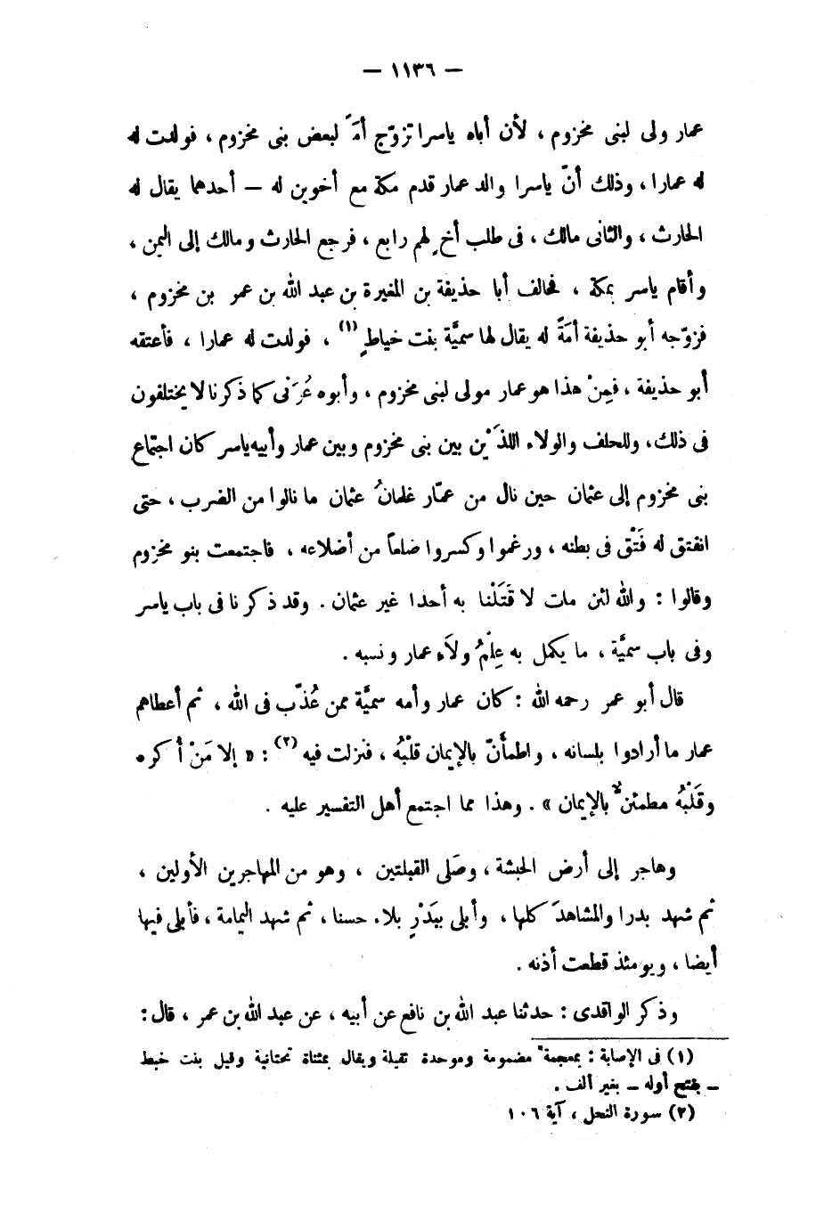 قال أَبُو عُمَر رحمه الله: كَانَ عَمَّار وأمه سمية ممن عذب فِي الله، ثُمَّ أعطاهم عَمَّار مَا أرادوا بلسانه، واطمأن بالإيمان قلبه، فنزلت فِيهِ [٢] : «إِلَّا مَنْ أُكْرِهَ وَقَلْبُهُ مُطْمَئِنٌّ بِالْإِيمانِ» . ١٦: ١٠٦ وهذا مما اجتمع أهل التفسير عَلَيْهِ.