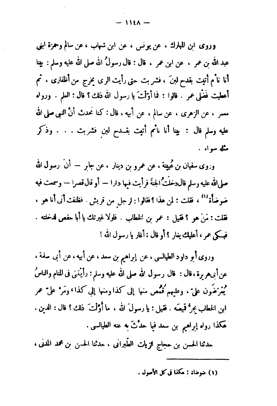 فبكى عمر، أَعَلَيْكَ يَغَارُ؟ أَوْ قَالَ: أَغَارُ يَا رَسُولَ اللَّهِ! وَرَوَى أَبُو دَاوُدَ الطَّيَالِسِيُّ، عَنْ إِبْرَاهِيمَ بن سعد، عن أبيه، عن أبي سلمة، عن أبي هريرة، قال: قال رسول الله صَلَّى اللَّهُ عَلَيْهِ وَسَلَّمَ: رَأَيْتُنِي فِي الْمَنَامِ وَالنَّاسُ يُعْرَضُونَ عَلَيَّ، وَعَلَيْهِمْ قُمُصٌ مِنْهَا إِلَى كَذَا وَمِنْهَا إِلَى كَذَا، وَمَرَّ عَلَيَّ عُمَرُ ابن الْخَطَّابِ يَجُرُّ قَمِيصَهُ. فَقِيلَ: يَا رَسُولَ اللَّهِ، مَا أَوَّلْتَ ذَلِكَ؟ قَالَ: الدِّينُ.
