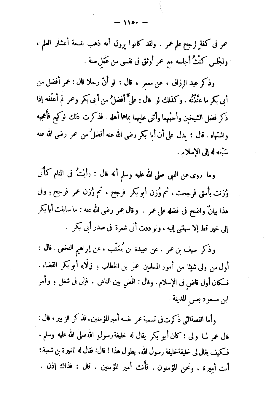 وذكر عَبْد الرَّزَّاقِ، عَنْ مَعْمَر، قَالَ: لو أن رجلا قَالَ: عُمَر أفضل من أَبِي بكرٍ مَا عنفته، وكذلك لو قَالَ: علي أفضل من أَبِي بَكْر وَعُمَر لم أعنفه إذا ذكر فضل الشيخين وأحبهما وأثنى عليهما بما هما أهله. فذكرت ذَلِكَ لوكيع فأعجبه واشتهاه. قال: يدل على أن أَبَا بَكْر رَضِيَ اللَّهُ عَنْهُ أفضل من عُمَر رَضِيَ اللَّهُ عَنْهُ سبقه لَهُ إِلَى الإسلام.