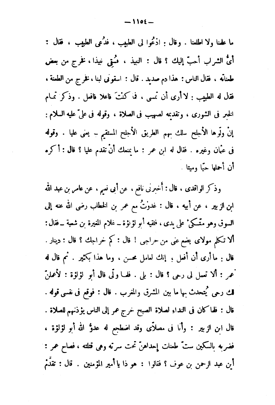 أَيُّ الشَّرَابِ أَحَبُّ إِلَيْكَ؟ قَالَ: النَّبِيذُ، فَسُقِيَ نَبِيذًا، فَخَرَجَ مِنْ بَعْضِ طَعَنَاتِهِ، فَقَالَ النَّاسُ: هَذَا دَمُ صَدِيدٍ. قَالَ: اسْقُونِي لَبَنًا، فَخَرَجَ مِنَ الطَّعْنَةِ، فَقَالَ لَهُ الطَّبِيبُ: لا أَرَى أَنْ تُمْسِيَ، فَمَا كُنْتَ فَاعِلا فَافْعَلْ. وذكر تمام الخبر فِي الشورى، وتقديمه لصهيب فِي الصلاة، وقوله فِي علي عَلَيْهِ السلام: