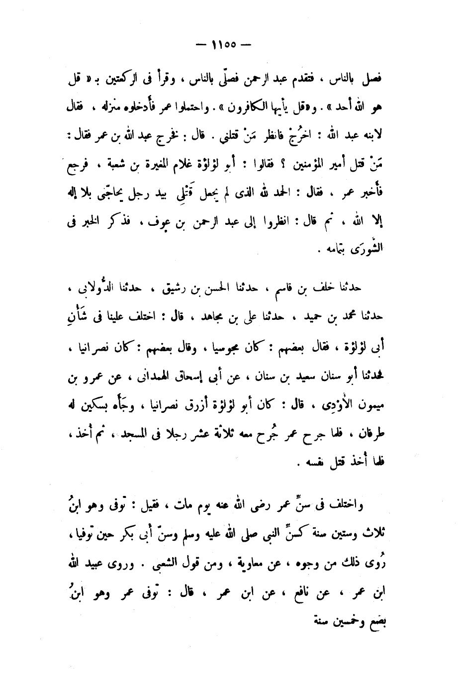 فَصَلِّ بِالنَّاسِ، فَتَقَدَّمَ عَبْدُ الرَّحْمَنِ فَصَلَّى بِالنَّاسِ، وقرأ في الركعتين ب «قُلْ هُوَ الله أَحَدٌ» ١١٢: ١. وقُلْ يا أَيُّهَا الْكافِرُونَ ١٠٩: ١. وَاحْتَمَلُوا عُمَرَ فَأَدْخَلُوهُ مَنْزِلَهُ، فَقَالَ لابْنِهِ عَبْدِ اللَّهِ: اخْرُجْ فَانْظُرْ مَنْ قَتَلَنِي. قَالَ: فَخَرَجَ عَبْدُ اللَّهِ بْنُ عُمَرَ فَقَالَ: