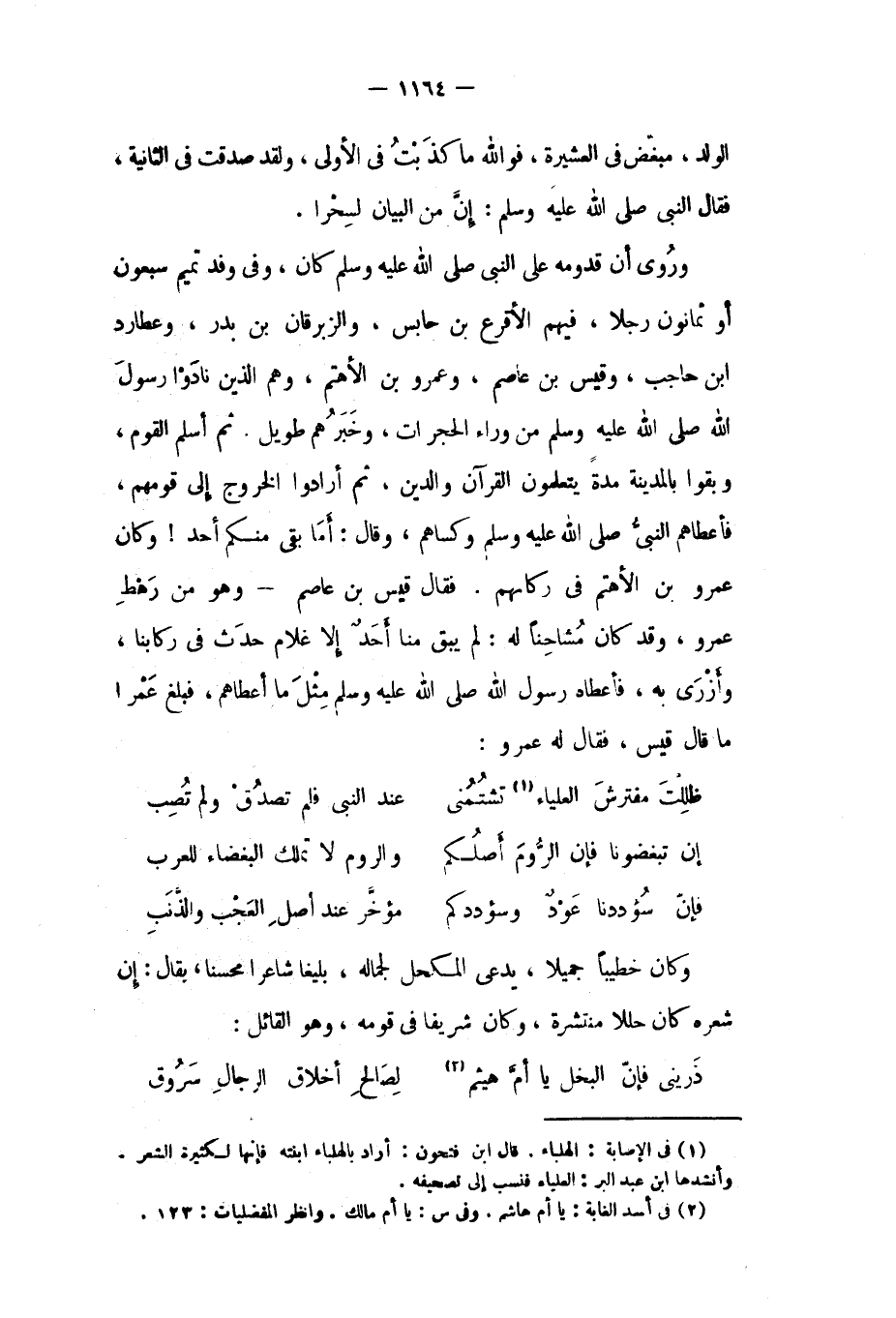الولد، مبغّض في العشيرة، فو الله مَا كذبت فِي الأولى، ولقد صدقت فِي الثانية، فَقَالَ النَّبِيّ صَلَّى اللَّهُ عَلَيْهِ وَسَلَّمَ: إن من البيان لسحرا. وروي أن قدومه على النَّبِيّ صَلَّى اللَّهُ عَلَيْهِ وَسَلَّمَ كَانَ، وفي وفد تميم سبعون أو ثمانون رجلا، فيهم الأقرع بْن حابس، والزبرقان بْن بدر، وعطارد ابن حاجب، وقيس بْن عَاصِم، وَعَمْرو بْن الأهتم، وهم الذين نادوا رَسُول اللَّهِ صَلَّى اللَّهُ عَلَيْهِ وَسَلَّمَ من وراء الحجرات، وخبرهم طويل. ثُمَّ أسلم القوم، وبقوا بالمدينة مدةً يتعلمون القرآن والدين، ثُمَّ أرادوا الخروج إِلَى قومهم، فأعطاهم النَّبِيّ صَلَّى اللَّهُ عَلَيْهِ وَسَلَّمَ وكساهم، وَقَالَ: أما بقي منكم أحد! وَكَانَ عَمْرو بْن الأهتم فِي ركابهم. فقال قَيْس بْن عَاصِم- وَهُوَ من رهط عَمْرو، وقد كَانَ مشاحنا لَهُ: لم يبق منا أحد إلا غلام حدث فِي ركابنا، وأزرى بِهِ، فأعطاه رسول الله صلى الله عليه وسلم مثل مَا أعطاهم، فبلغ عمرا مَا قَالَ قَيْس، فقال له عمرو: