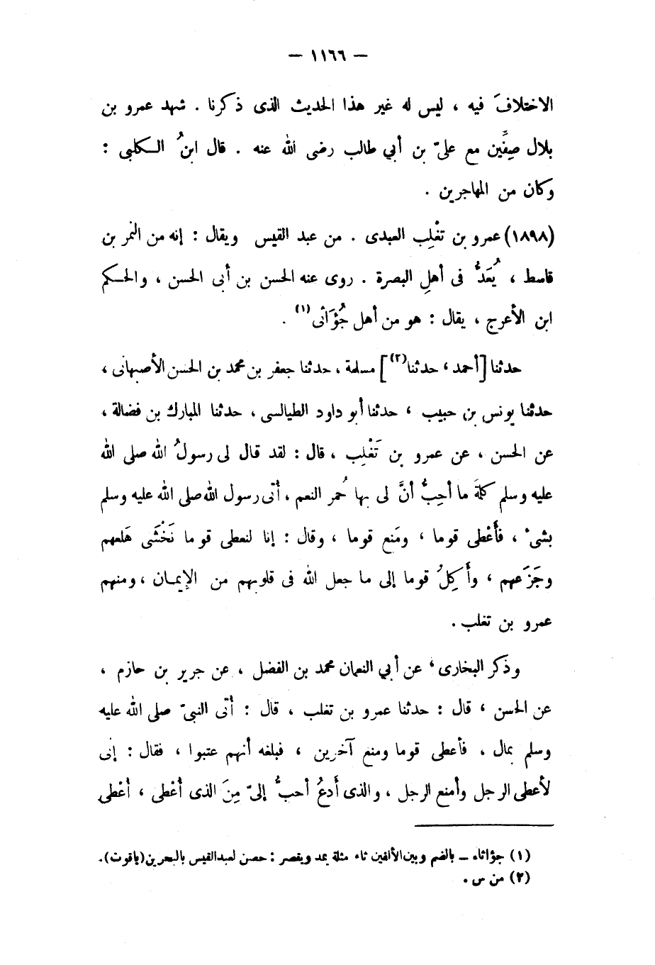 حَدَّثَنَا [أَحْمَدُ، حَدَّثَنَا [٢]] مَسْلَمَةُ، حَدَّثَنَا جَعْفَرُ بْنُ مُحَمَّدِ بْنِ الْحَسَنِ الأَصْبَهَانِيُّ، حَدَّثَنَا يُونُسُ بْنُ حَبِيبٍ، حَدَّثَنَا أَبُو دَاوُدَ الطَّيَالِسِيُّ، حَدَّثَنَا الْمُبَارَكُ بْنُ فَضَالَةَ، عَنِ الْحَسَنِ، عَنْ عَمْرِو بْنِ تَغْلِبَ، قَالَ: لَقَد قَالَ لِي رَسُولُ اللَّهِ صَلَّى اللَّهُ عَلَيْهِ وَسَلَّمَ كَلِمَةً مَا أُحِبُّ أَنَّ لِي بِهَا حُمْرَ النَّعَمِ، أَتَى رَسُولُ اللَّهِ صَلَّى اللَّهُ عَلَيْهِ وَسَلَّمَ بِشَيْءٍ، فَأَعْطَى قَوْمًا، وَمَنَعَ قَوْمًا، وَقَالَ: إِنَّا لَنُعْطِي قَوْمًا نَخْشَى هَلَعَهُمْ وَجَزَعَهُمْ، وَأَكِلُ قَوْمًا إِلَى مَا جَعَلَ اللَّهُ فِي قُلُوبِهِمْ مِنَ الإِيمَانِ، وَمِنْهُمْ عَمْرُو بْنُ تَغْلِبَ. وَذَكَرَ الْبُخَارِيُّ، عَنْ أَبِي النُّعْمَانِ مُحَمَّدِ بْنِ الْفَضْلِ، عَنْ جَرِيرِ بْنِ حَازِمٍ، عَنِ الْحَسَنِ، قَالَ: حَدَّثَنَا عَمْرُو بْنُ تَغْلِبَ، قَالَ: أُتِيَ النَّبِيُّ صَلَّى اللَّهُ عَلَيْهِ وَسَلَّمَ بِمَالٍ، فَأَعْطَى قَوْمًا وَمَنَعَ آخَرِينَ، فَبَلَغَهُ أَنَّهُمْ عَتَبُوا، فَقَالَ: إِنِّي لأُعْطِي الرَّجُلَ وَأَمْنَعُ الرَّجُلَ، وَالَّذِي أَدَعُ أَحَبُّ إِلَيَّ مِنَ الَّذِي أُعْطِي، أعطى