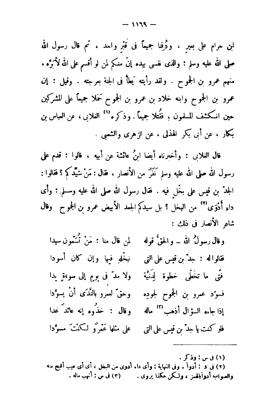 الجد بن قيس على بخل فيه. فقال رَسُولُ اللَّهِ صَلَّى اللَّهُ عَلَيْهِ وَسَلَّمَ: وَأَيُّ دَاءٍ أَدْوَى [٢] مِنَ الْبُخْلِ؟ بَلْ سَيِّدُكُمْ الْجَعْدُ الأَبْيَضُ عَمْرُو بْنُ الْجَمُوحِ وقال شاعر الأنصار في ذلك: