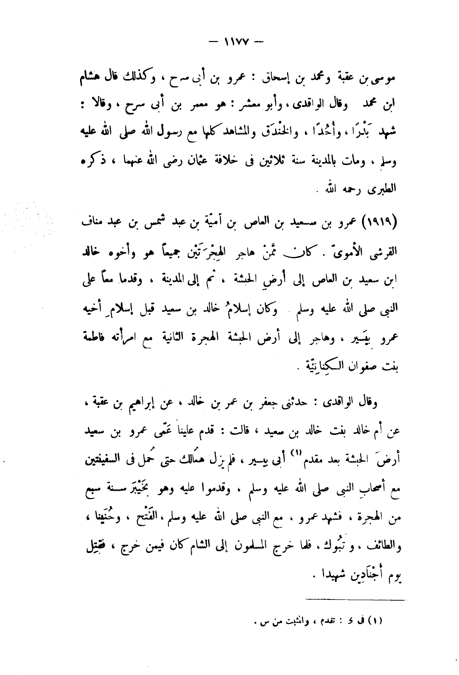 وقال الْوَاقِدِيّ: حَدَّثَنِي جَعْفَرُ بْنُ عُمَرَ بْنِ خَالِدٍ، عَنْ إِبْرَاهِيمَ بن عقبة، عن أم خالد بنت خالد بْنِ سَعِيدٍ، قَالَتْ: قَدِمَ عَلَيْنَا عَمِّي عَمْرُو بْنُ سَعِيدٍ أَرْضَ الْحَبَشَةِ بَعْدَ مَقْدَمِ [١] أَبِي بيسير، فلم يزل هما لك حَتَّى حُمِلَ فِي السَّفِينَتَيْنِ مَعَ أَصْحَابِ النَّبِيِّ صَلَّى اللَّهُ عَلَيْهِ وَسَلَّمَ، وَقَدِمُوا عَلَيْهِ وَهُوَ بِخَيْبَرَ سَنَةَ سَبْعٍ مِنَ الْهِجْرَةِ، فَشَهِدَ عَمْرٌو، مع النبي صلى الله عليه وسلم، الفتح، وَحُنَيْنًا، وَالطَّائِفَ، وَتَبُوكَ، فَلَمَّا خَرَجَ الْمُسْلِمُونَ إِلَى الشَّامِ كَانَ فِيمَنْ خَرَجَ، فَقُتِلَ يَوْم أَجْنَادِينَ شهيدا.