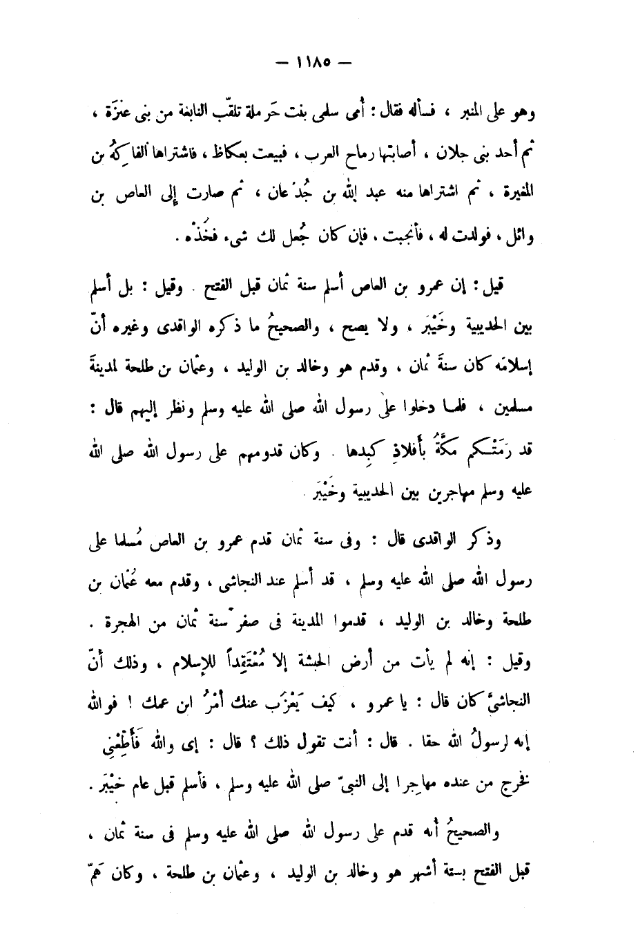 وذكر الْوَاقِدِيّ قَالَ: وفي سنة ثمان قدم عَمْرو بْن الْعَاص مسلما على رسول الله صلى الله عليه وسلم، قد أسلم عِنْدَ النجاشي، وقدم معه عُثْمَان بْن طَلْحَة وخالد بْن الْوَلِيد، قدموا المدينة فِي صفر سنة ثمانٍ من الهجرة.