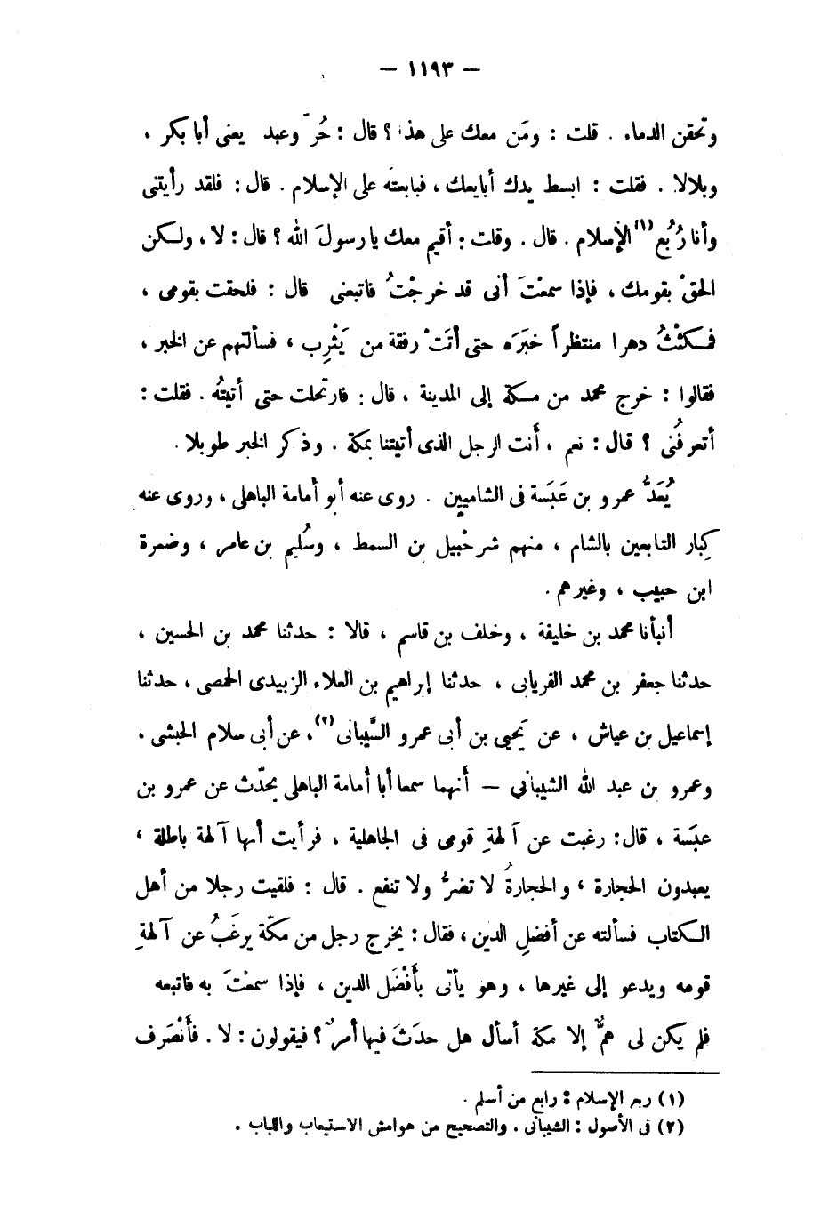 أَنْبَأَنَا مُحَمَّدُ بْنُ خَلِيفَةَ، وَخَلَفُ بْنُ قَاسِمٍ، قَالا: حَدَّثَنَا مُحَمَّدُ بْنُ الْحُسَيْنِ، حدثنا جعفر بن محمد الفرياني، حَدَّثَنَا إِبْرَاهِيمُ بْنُ الْعَلاءِ الزُّبَيْدِيُّ الْحِمْصِيُّ، حَدَّثَنَا إِسْمَاعِيلُ بْنُ عَيَّاشٍ، عَنْ يَحْيَى بْنِ أَبِي عمرو السّيبانى [٢] ، عَنْ أَبِي سَلامٍ الْحَبَشِيِّ، وَعَمْرِو بْنِ عَبْدِ اللَّهِ الشَّيْبَانِيِّ- أنهما سمعا أبا أمامة الباهلي يُحَدِّثُ عَنْ عَمْرِو بْنِ عَبْسَةَ، قَالَ: رَغِبْتُ عَنْ آلِهَةِ قَوْمِي فِي الْجَاهِلِيَّةِ، فَرَأَيْتُ أَنَّهَا آلِهَةٌ بَاطِلَةٌ، يَعْبُدُونَ الْحِجَارَةَ، وَالْحِجَارَةُ لا تَضُرُّ وَلا تَنْفَعُ. قَالَ: فَلَقِيتُ رَجُلا مِنْ أَهْلِ الْكِتَابِ فَسَأَلْتُهُ عَنْ أَفْضَلِ الدِّينِ، فَقَالَ: يَخْرُجُ رَجُلٌ مِنْ مَكَّةَ يَرْغَبُ عَنْ آلِهَةِ قَوْمِهِ وَيَدْعُو إِلَى غَيْرِهَا، وَهُوَ يَأْتِي بِأَفْضَلِ الدِّينِ، فَإِذَا سَمِعْتَ بِهِ فَاتَّبِعْهُ فَلَمْ يَكُنْ لِي همّ إلا مكة أسأل هل حديث فيها أمر؟ فيقولون: لا. فأنصرف