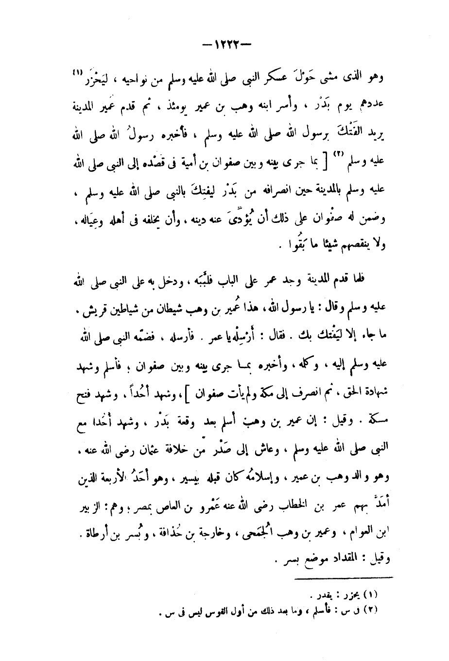 وَهُوَ الَّذِي مشى حول عسكر النَّبِيّ صَلَّى اللَّهُ عَلَيْهِ وَسَلَّمَ من نواحيه، ليحزر [١] عددهم يَوْم بدر، وأسر ابنه وَهْب بْن عُمَيْر يومئذ، ثُمَّ قدم عُمَيْر المدينة يريد الفتك برسول الله صَلَّى اللَّهُ عَلَيْهِ وَسَلَّمَ، فأخبره رَسُول اللَّهِ صَلَّى اللَّهُ عَلَيْهِ وَسَلَّمَ [٢] [بما جرى بينه وبين صَفْوَان بْن أُمَيَّة فِي قصده إِلَى النَّبِيّ صَلَّى اللَّهُ عَلَيْهِ وَسَلَّمَ بالمدينة حين انصرافه من بدر ليفتك بالنبي صَلَّى اللَّهُ عَلَيْهِ وَسَلَّمَ، وضمن لَهُ صَفْوَان على ذَلِكَ أن يؤدي عَنْهُ دينه، وأن يخلفه فِي أهله وعياله، ولا ينقصهم شيئا مَا بقوا.