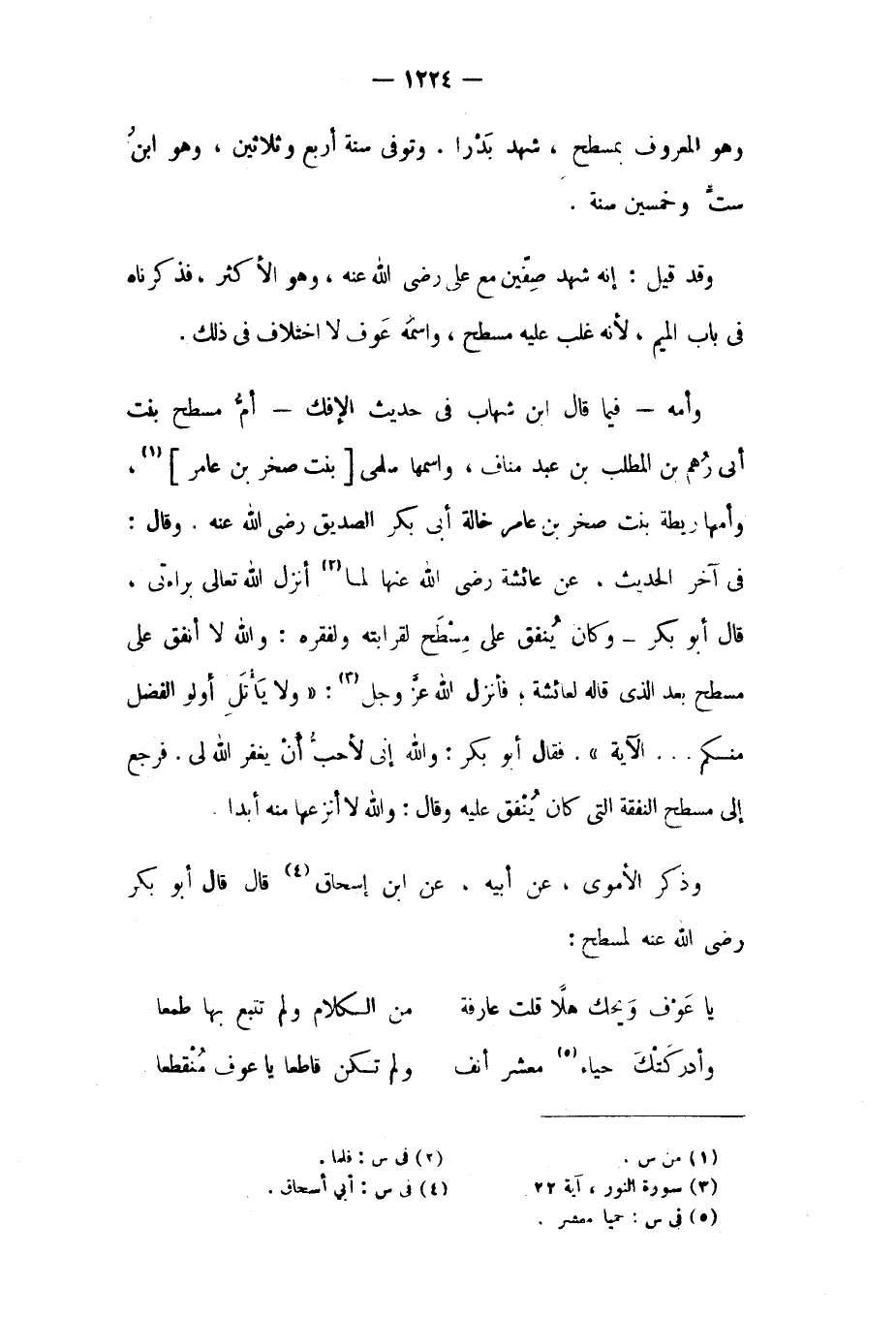 وذكر الأموي، عَنْ أَبِيهِ، عَنِ ابْن إِسْحَاق [٤] قَالَ قَالَ أَبُو بَكْر رضى الله عنه لمسطح: