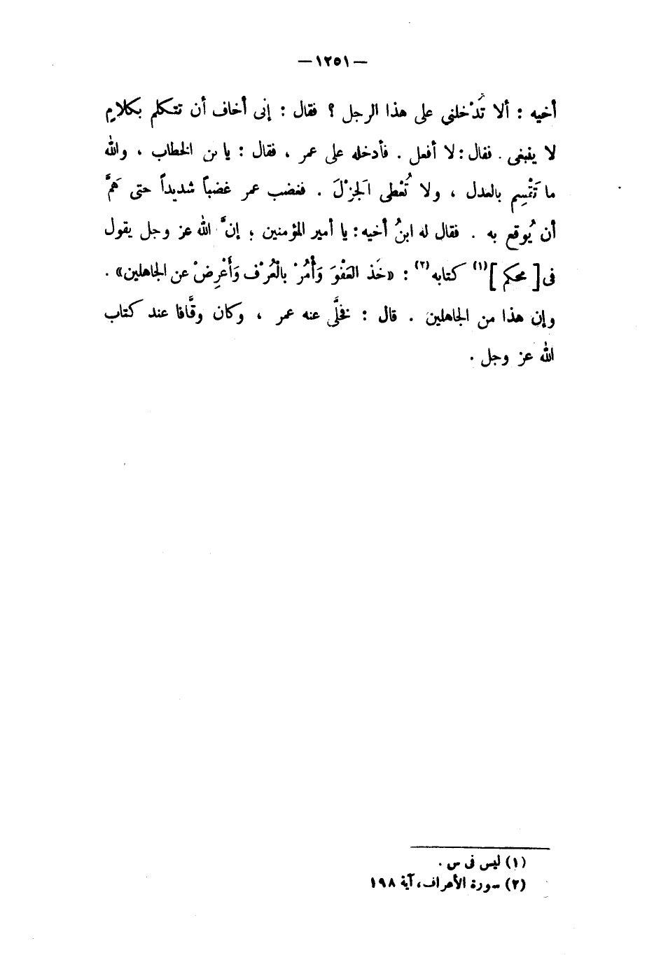 أخيه: ألا تدخلني على هذا الرجل؟ فقال: إني أخاف أن تتكلم بكلام لا ينبغي. فقال: لا أفعل. فأدخله على عمر، فقال: يا بن الخطاب، والله مَا تقسم بالعدل، ولا تعطي الجزل. فغضب عمر غضبا شديدا حتى هم أن يوقع بِهِ. فَقَالَ لَهُ ابْن أخيه: يَا أمير المؤمنين، إن الله عز وجل يَقُول فِي [محكم] [١] كتابه [٢] : خُذِ الْعَفْوَ وَأْمُرْ بِالْعُرْفِ وَأَعْرِضْ عَنِ الْجاهِلِينَ ٧: ١٩٩.