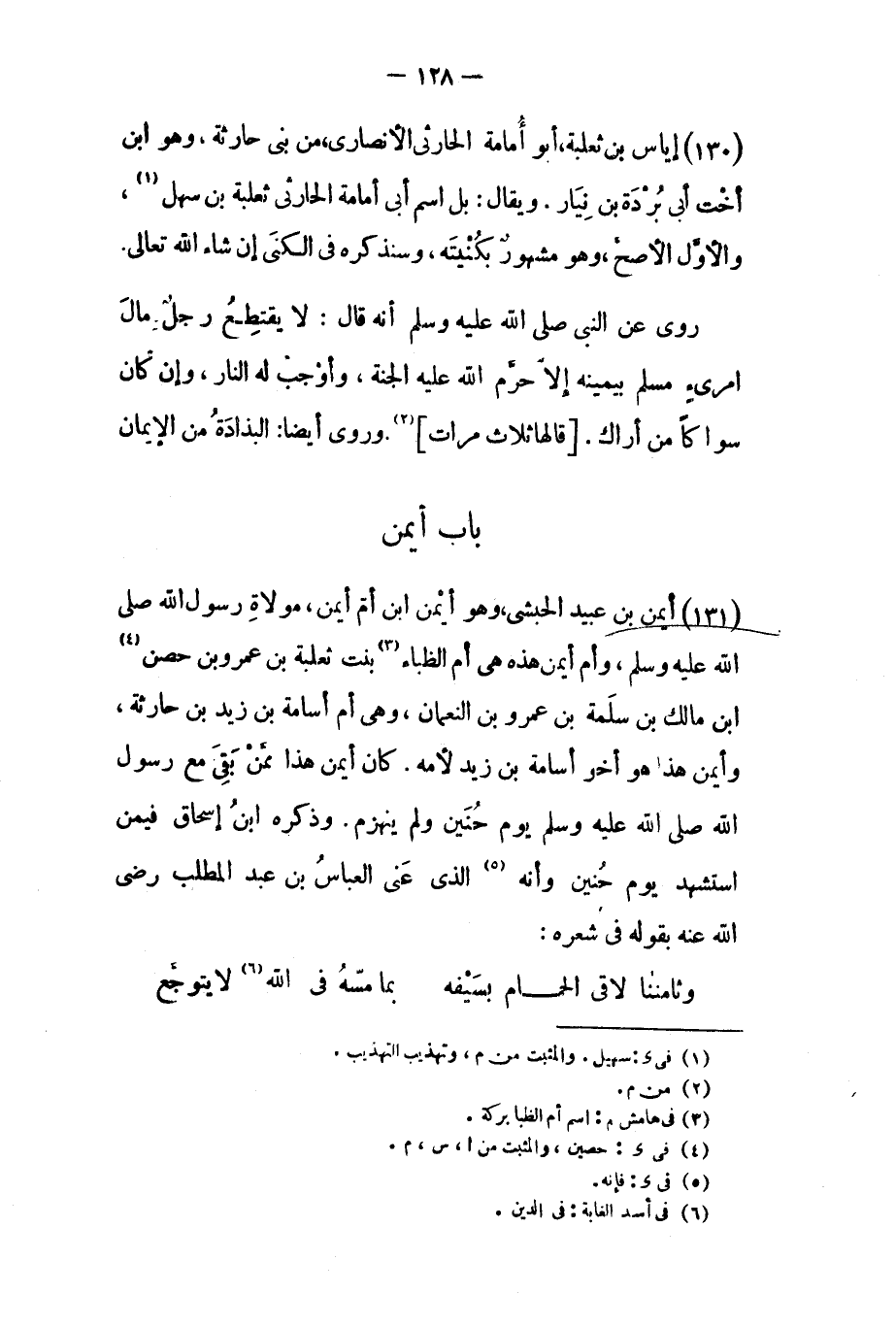 وهو أيمن ابن أم أيمن، مولاة رسول الله صَلَّى اللَّهُ عليه وَسَلَّمَ، وأم أيمن هذه هي أم الظباء [٣] بنت ثعلبة بن عمرو بن حصن [٤] ابن مالك بن سلمة بن عمرو بن النعمان، وهي أم أسامة بن زيد بن حارثة، وأيمن هذا هو أخو أسامة بن زيد لأمه. كان أيمن هذا ممن بقي مع رسول الله صلى الله عليه وسلم يوم حنين ولم ينهزم. وذكره ابن إسحاق فيمن استشهد يوم حنين وأنه [٥] الذي عنى العباس بن عَبْد المطلب رضي الله عنه بقوله في شعره: