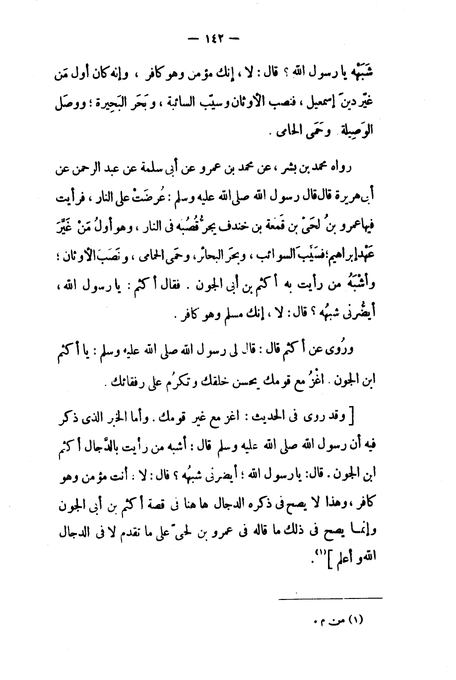 شبهه يا رسول الله؟ قَالَ: لا، إنك مؤمن وهو كافر، وإنه كان أول من غير دين إسماعيل، فنصب الأوثان وسيب السائبة، وبحر البحيرة، ووصل الوصيلة وحمى الحامي. رَوَاهُ مُحَمَّدُ بْنُ بِشْرٍ، عَنْ مُحَمَّدِ بْنِ عَمْرٍو عَنْ أَبِي سَلَمَةَ عَنْ عَبْدِ الرَّحْمَنِ عَنْ أبي هريرة قال قال رسول الله صلى الله عليه وَسَلَّمَ: عُرِضَتْ عَلَيَّ النَّارُ، فَرَأَيْتُ فِيهَا عَمْرَو بن لحي بن قمعة بن خندف يجر قُصْبَهُ فِي النَّارِ، وَهُوَ أَوَّلُ مَنْ غَيَّرَ عَهْدَ إِبْرَاهِيمَ، فَسَيَّبَ السَّوَائِبَ، وَبَحَرَ الْبَحَائِرَ، وَحَمَى الحمامي، وَنَصَبَ الأَوْثَانَ، وَأَشْبَهُ مَنْ رَأَيْتُ بِهِ أَكْثَمُ بْنُ أَبِي الْجَوْنِ. فَقَالَ أَكْثَمُ: يَا رَسُولَ اللَّهِ، أَيَضُرُّنِي شَبَهُهُ؟ قَالَ: لا، إِنَّكَ مُسْلِمٌ وَهُوَ كَافِرٌ. وروى عن أكثم قَالَ: قَالَ لي رسول الله صلى الله عليه وسلم: يا أكثم ابن الجون. أغز مع قومك يحسن خلقك وتكرم على رفقائك. [وقد روى في الحديث: اغز مع غير قومك. وأما الخبر الذي ذكر فيه أن رسول الله صَلَّى الله عليه وَسَلَّمَ قَالَ: أشبه من رأيت بالدجال أكثم ابن الجون. قَالَ: يا رسول الله، أيضرني شبهه؟ قَالَ: لا، أنت مؤمن وهو كافر، وهذا لا يصح في ذكره الدجال هاهنا في قصة أكثم بن أبي الجون وإنما يصح في ذلك ما قاله في عمرو بن لحي على ما تقدم لا في الدجال الله وأعلم] [١] .