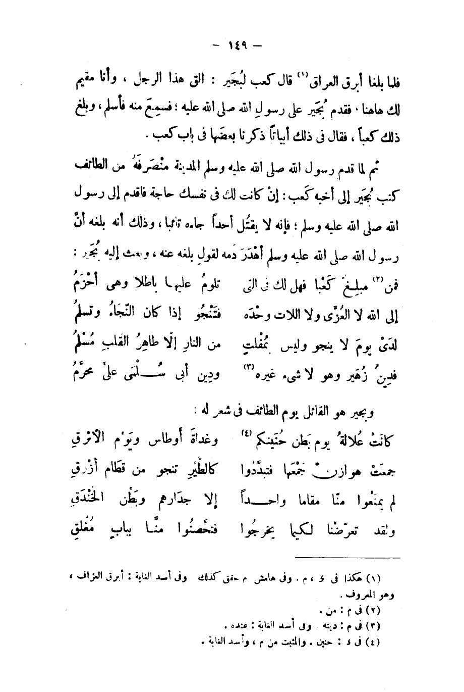 فلما بلغا أبرق العراق [١] قَالَ كعب لبجير: الق هذا الرجل، وأنا مقيم لك هاهنا، فقدم بجير على رسول الله صلى الله عليه، فسمع منه فأسلم، وبلغ ذلك كعبًا، فقال في ذلك أبياتًا ذكرنا بعضها في باب كعب.