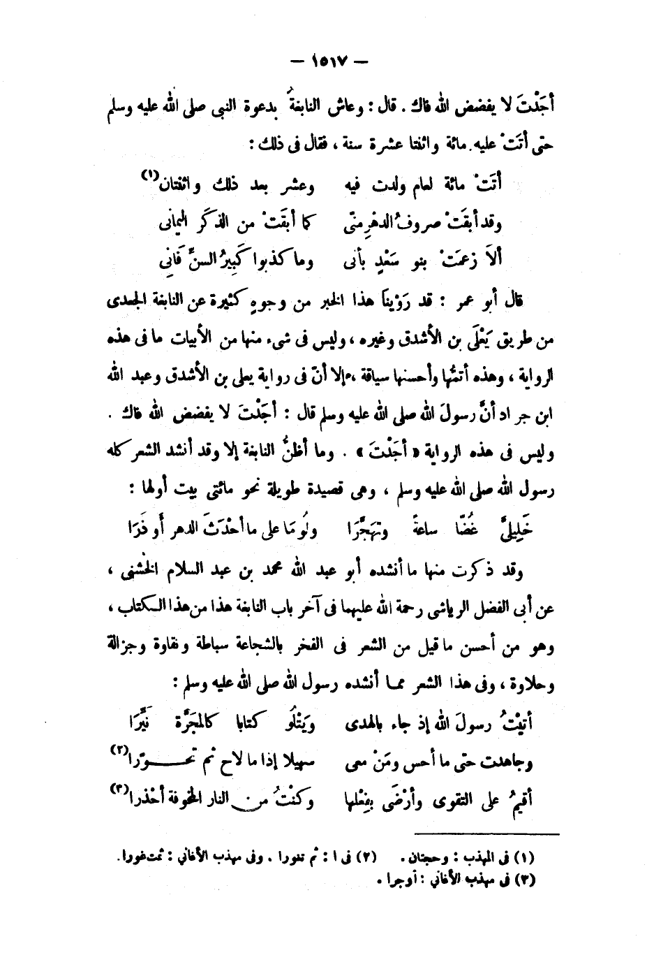 وقد ذكرت منها ما أنشده أَبُو عَبْد اللَّهِ مُحَمَّد بْن عبد السلام الخشني، عَنْ أبي الفضل الرياشي رحمة اللَّه عليهما فِي آخر باب النابغة هَذَا من هَذَا الكتاب، وَهُوَ من أحسن مَا قيل من الشعر فِي الفخر بالشجاعة سباطة ونقاوة وجزالة وحلاوة، وفي هَذَا الشعر مما أنشده رسول الله صلى الله عليه وسلم: