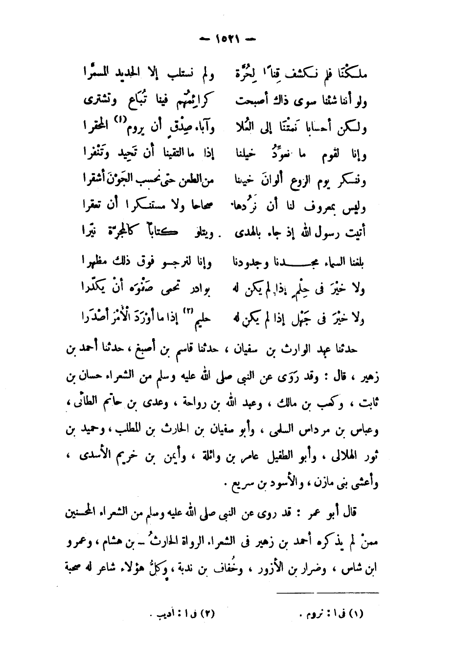 حَدَّثَنَا عَبْدُ الْوَارِثِ بن سفيان، حدثنا قاسم بن أصبغ، حدثنا أَحْمَد بْن زهير، قَالَ: وقد روى عَنِ النَّبِيّ صَلَّى اللَّهُ عَلَيْهِ وَسَلَّمَ من الشعراء حسان بن ثابت، وكعب بن مالك، وعبد اللَّهِ بْن رواحة، وعدي بْن حاتم الطائي، وعباس بْن مرداس السلمي، وأبو سُفْيَان بْن الحارث بْن المطلب، وحميد بْن ثور الهلالي، وأبو الطفيل عامر بْن وائلة، وأيمن بْن خريم الأسدي، وأعشى بني مازن، والأسود بْن سريع.