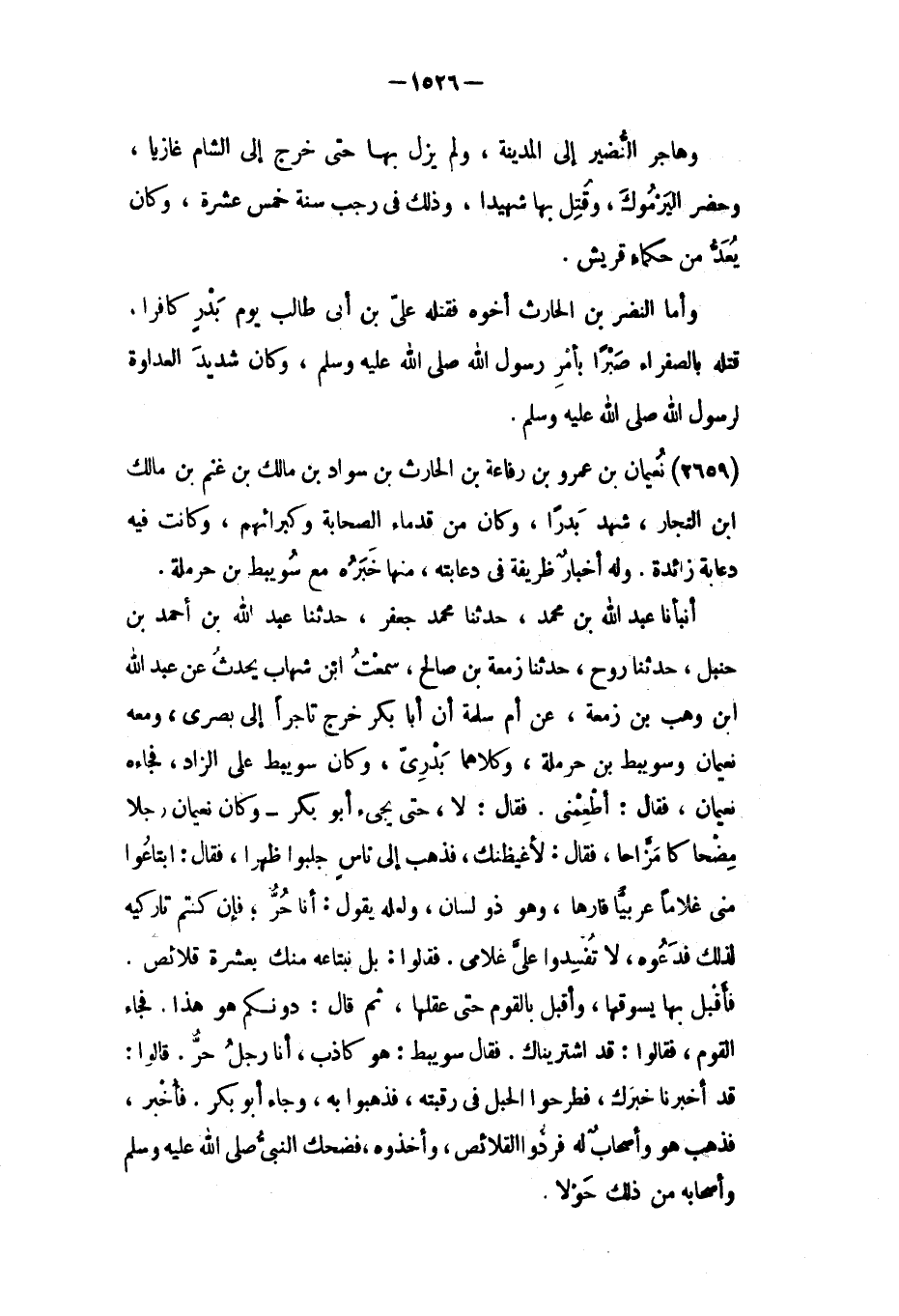 أَنْبَأَنَا عَبْدُ اللَّهِ بْنُ مُحَمَّدٍ، حدثنا محمد جَعْفَرٍ، حَدَّثَنَا عَبْدُ اللَّهِ بْنُ أَحْمَدَ بْنِ حَنْبَلٍ، حَدَّثَنَا رُوحٌ، حَدَّثَنَا زَمْعَةُ بْنُ صَالِحٍ، سَمِعْتُ ابْنَ شِهَابٍ يُحَدِّثُ عَنْ عَبْدِ اللَّهِ ابن وَهْبِ بْنِ زَمْعَةَ، عَنْ أُمِّ سَلَمَةَ أَنَّ أَبَا بَكْرٍ خَرَجَ تَاجِرًا إِلَى بُصْرَى، وَمَعَهُ نُعَيْمَانُ وَسُوَيْبِطُ بْنُ حَرْمَلَةَ، وَكِلاهُمَا بَدْرِيٌّ، وَكَانَ سُوَيْبِطٌ عَلَى الزَّادِ، فَجَاءَهُ نُعَيْمَانُ، فَقَالَ: أَطْعِمْنِي. فَقَالَ: لا، حَتَّى يَجِيءَ أَبُو بَكْرٍ- وَكَانَ نُعَيْمَانُ رَجُلا مِضْحَاكًا مَزَّاحًا، فَقَالَ: لأَغِيظَنَّكَ، فَذَهَبَ إِلَى نَاسٍ جَلَبُوا ظَهْرًا، فَقَالَ: ابْتَاعُوا مِنِّي غُلامًا عَرَبِيًّا فَارِهًا، وَهُوَ ذُو لِسَانٍ، وَلَعَلَّهُ يَقُولُ: أَنَا حُرٌّ، فَإِنْ كُنْتُمْ تَارِكِيهِ لِذَلِكَ فَدَعُوهُ، لا تُفْسِدُوا عَلَيَّ غُلامِي. فَقَالُوا: بَلْ نَبْتَاعُهُ مِنْكَ بِعَشْرَةِ قَلائِصَ.