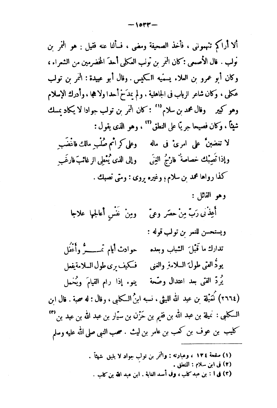 ألا أراكم تتهمونني، فأخذ الصحيفة ومضى، فسألنا عنه فقيل: هُوَ النمر بْن تولب. قَالَ الأصمعي: كَانَ النمر بْن تولب العكلي أحد المخضرمين من الشعراء، وَكَانَ أَبُو عَمْرو بْن العلاء يسميه الكيس. وَقَالَ أَبُو عبيدة: النمر بْن تولب عكلي، وَكَانَ شاعر الرباب فِي الجاهلية، ولم يمدح أحدًا ولا هجا، وأدرك الإسلام وَهُوَ كبير وَقَالَ مُحَمَّد بْن سلام [١] : كَانَ النمر بْن تولب جوادًا لا يكاد يمسك شَيْئًا، وَكَانَ فصيحًا جريًا عَلَى النطق [٢] ، وهو الّذي يقول: