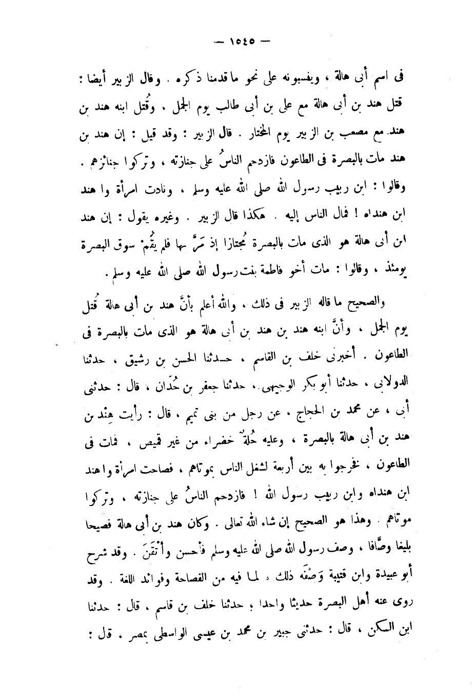 والصحيح مَا قاله الزُّبَيْر فِي ذلك، والله أعلم بأن هند بْن أبي هالة قتل يوم الجمل، وأن ابنه هند بْن هند بْن أبي هالة هُوَ الَّذِي مات بالبصرة فِي الطاعون. أَخْبَرَنِي خَلَفُ بْنُ الْقَاسِمِ، حَدَّثَنَا الْحَسَنُ بْنُ رشيق، حدثنا الدولابي، حدثنا أبو بكر الوجيهي، حَدَّثَنَا جَعْفَرُ بْنُ حُدَّانَ، قَالَ: حَدَّثَنِي أَبِي، عَنْ مُحَمَّدِ بْنِ الْحَجَّاجِ، عَنْ رَجُلٍ مِنْ بَنِي تَمِيمٍ، قَالَ: رَأَيْتُ هِنْدَ بْنَ هِنْدِ بْنِ أَبِي هَالَةَ بِالْبَصْرَةِ، وَعَلَيْهِ حُلَّةٌ خَضْرَاءُ مِنْ غَيْرِ قَمِيصٍ، فَمَاتَ فِي الطَّاعُونِ، فَخَرَجُوا بِهِ بَيْنَ أَرْبَعَةٍ لِشَغْلِ النَّاسِ بِمَوْتَاهُمْ، فَصَاحَتِ امرأة وا هند ابن هِنْدَاهْ وَابْنَ رَبِيبِ رَسُولِ اللَّهِ! فَازْدَحَمَ النَّاسُ عَلَى جِنَازَتِهِ، وَتَرَكُوا مَوْتَاهُمْ. وَهَذَا هُوَ الصَّحِيحُ إِنْ شَاءَ اللَّهُ تَعَالَى. وَكَانَ هِنْدُ بْنُ أَبِي هَالَةَ فَصِيحًا بَلِيغًا وَصَّافًا، وَصَفَ رَسُولَ اللَّهِ صَلَّى اللَّهُ عَلَيْهِ وَسَلَّمَ فَأَحْسَنَ وَأَتْقَنَ. وَقَدْ شَرَحَ أَبُو عُبَيْدَةَ وَابْنُ قُتَيْبَةَ وَصْفَهُ ذَلِكَ، لِمَا فِيهِ مِنَ الْفَصَاحَةِ وَفَوَائِدِ اللُّغَةِ. وقد روى عنه أهل البصرة حديثًا واحدًا، حَدَّثَنَا خَلَفُ بْنُ قَاسِمٍ، قَالَ: حَدَّثَنَا ابْنُ السَّكَنِ، قَالَ: حَدَّثَنِي جُبَيْرُ بْنُ مُحَمَّدِ بْنِ عِيسَى الْوَاسِطِيُّ بِمِصْرَ. قَالَ: