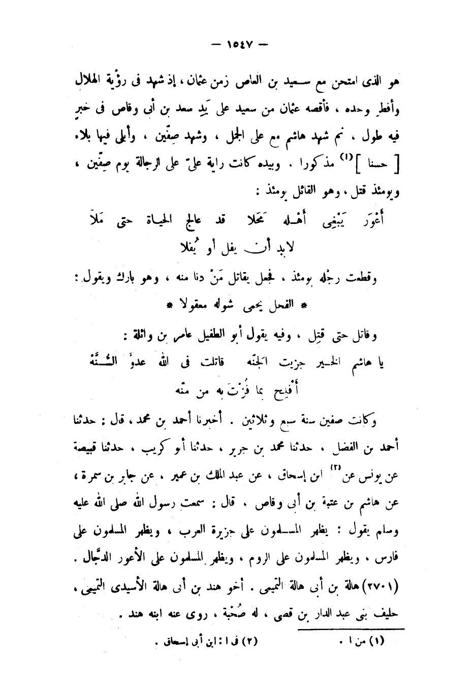 وكانت صفين سنة سبع وثلاثين. أَخْبَرَنَا أَحْمَدُ بْنُ مُحَمَّدٍ، قَالَ: حَدَّثَنَا أَحْمَدُ بْنُ الْفَضْلِ، حَدَّثَنَا مُحَمَّدُ بْنُ جَرِيرٍ، حَدَّثَنَا أَبُو كُرَيْبٍ، حَدَّثَنَا قَبِيصَةَ عَنْ يُونُسَ عَنِ [٢] ابْنِ إِسْحَاقَ، عَنْ عَبْدِ الْمَلِكِ بْنِ عُمَيْرٍ، عَنْ جَابِرِ بْنِ سَمُرَةَ، عَنْ هَاشِمِ بْنِ عُتْبَةَ بْنِ أَبِي وَقَّاصٍ، قال: سمعت رَسُولَ اللَّهِ صَلَّى اللَّهُ عَلَيْهِ وَسَلَّمَ يَقُولُ: يَظْهَرُ الْمُسْلِمُونَ عَلَى جَزِيرَةِ الْعَرَبِ، وَيَظْهَرُ الْمُسْلِمُونَ عَلَى فَارِسَ، وَيَظْهَرُ الْمُسْلِمُونَ عَلَى الرُّومِ، وَيَظْهَرُ الْمُسْلِمُونَ عَلَى الأَعْوَرِ الدَّجَّالِ.