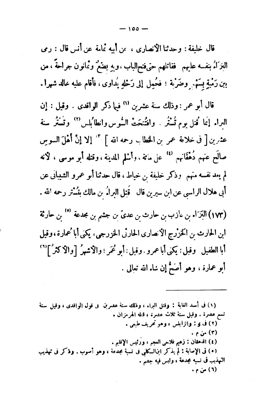 قَالَ أبو عمر: وذلك سنة عشرين [١] فيما ذكر الواقدي. وقيل: إن البراء إنما قتل يوم تستر، وافتتحت السوس وانطابلس [٢] وتستر سنة عشرين [في خلافة عمر بن الخطاب رحمه الله] [٣] إلا أن أهل السوس صالح عنهم دهقانهم [٤] على مائة، وأسلم المدينة، وقتله أبو موسى، لأنه لم يعد نفسه منهم وَذَكَرَ خَلِيفَةُ بْنُ خَيَّاطٍ، قَالَ حَدَّثَنَا أبو عمرو الشيباني عن أبى هلال الراسبي عَنِ ابْنِ سِيرِينَ قَالَ قُتِلَ الْبَرَاءُ بْنُ مَالِكٍ بتُسْتَرَ رَحِمَهُ اللَّهُ.