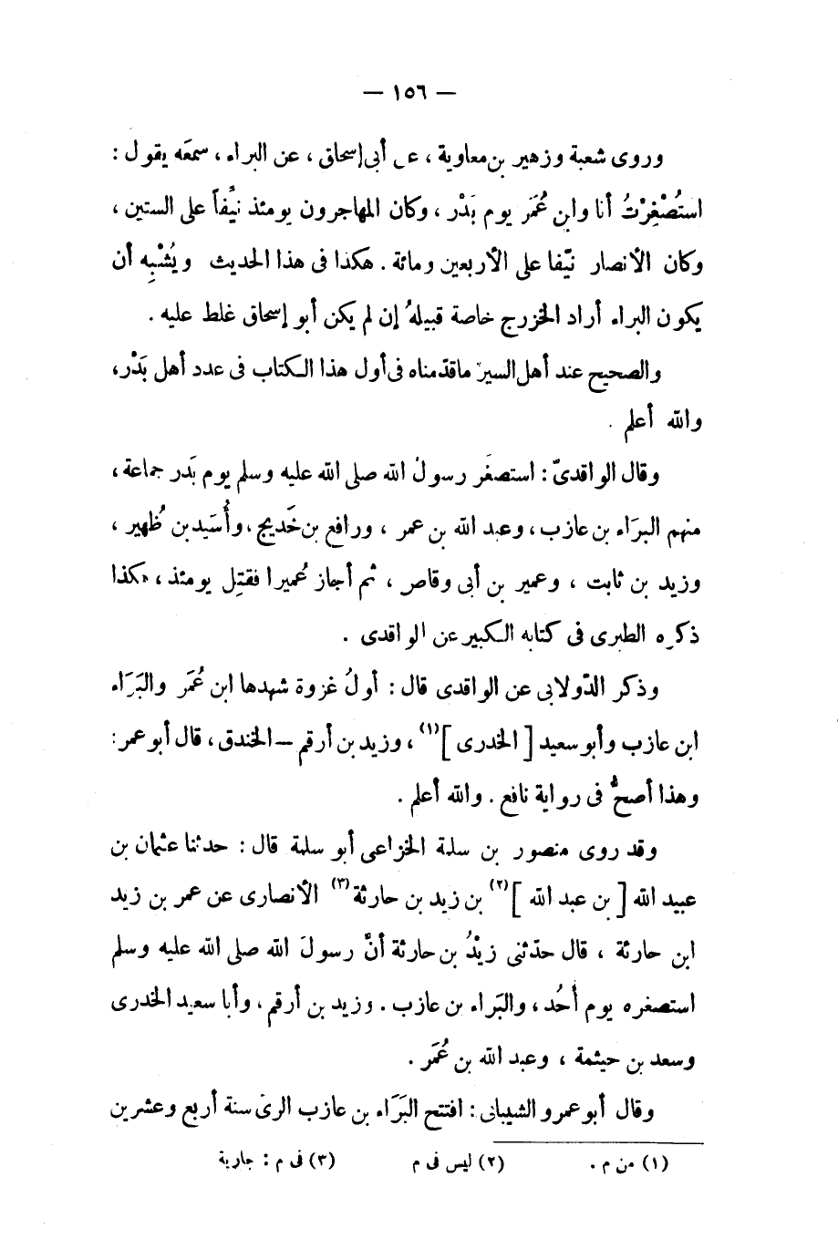 اسْتُصْغِرْتُ أَنَا وَابْنُ عُمَرَ يَوْمَ بَدْرٍ، وَكَانَ الْمُهَاجِرُونَ يَوْمَئِذٍ نَيِّفًا عَلَى السِّتِّينَ، وَكَانَ الأَنْصَارُ نَيِّفًا عَلَى الأربعين ومائة. هكذا في هذا الحديث ويشبه أن يكون البراء أراد الخزرج خاصة قبيلة إن لم يكن أبو إسحاق غلط عليه.