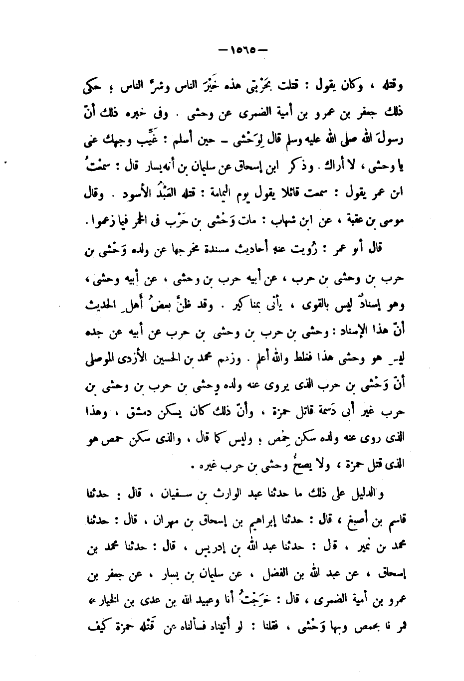 والدليل عَلَى ذلك مَا حَدَّثَنَا عَبْدُ الْوَارِثِ بن سفيان، قال: حدثنا قاسم بن أصبغ، قَالَ: حَدَّثَنَا إِبْرَاهِيمُ بْنُ إِسْحَاقَ بْنِ مِهْرَانَ، قَالَ: حَدَّثَنَا مُحَمَّدُ بْنُ نُمَيْرٍ، قَالَ: حَدَّثَنَا عَبْدُ اللَّهِ بْنُ إِدْرِيسَ، قَالَ: حَدَّثَنَا مُحَمَّدُ بْنُ إِسْحَاقَ، عَنْ عَبْدِ اللَّهِ بْنِ الْفَضْلِ، عَنْ سُلَيْمَانَ بْنِ يَسَارٍ، عَنْ جَعْفَرِ بْنِ عَمْرِو بْنِ أُمَيَّةَ الضَّمْرِيِّ، قَالَ: خَرَجْتُ أَنَا وعبيد الله بن عدي بن الخيار، فمرنا بِحِمْصَ وَبِهَا وَحْشِيٌّ، فَقُلْنَا: لَوْ أَتَيْنَاهُ فَسَأَلْنَاهُ عَنْ قَتْلِهِ حَمْزَةَ كَيْفَ
