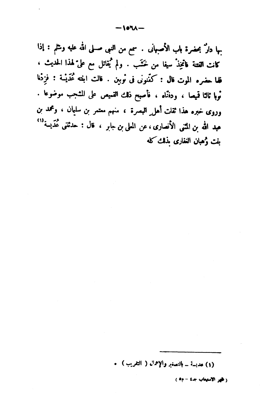 وروى خبره هَذَا ثقات أهل البصرة، منهم معتمر بْن سُلَيْمَانَ، ومحمد بْن عَبْد اللَّهِ بْن المثنى الأَنْصَارِيّ، عن المعلى بن جابر، قال: حدثني عديسة [١] بنت وهبان الغفاريّ بذلك كله