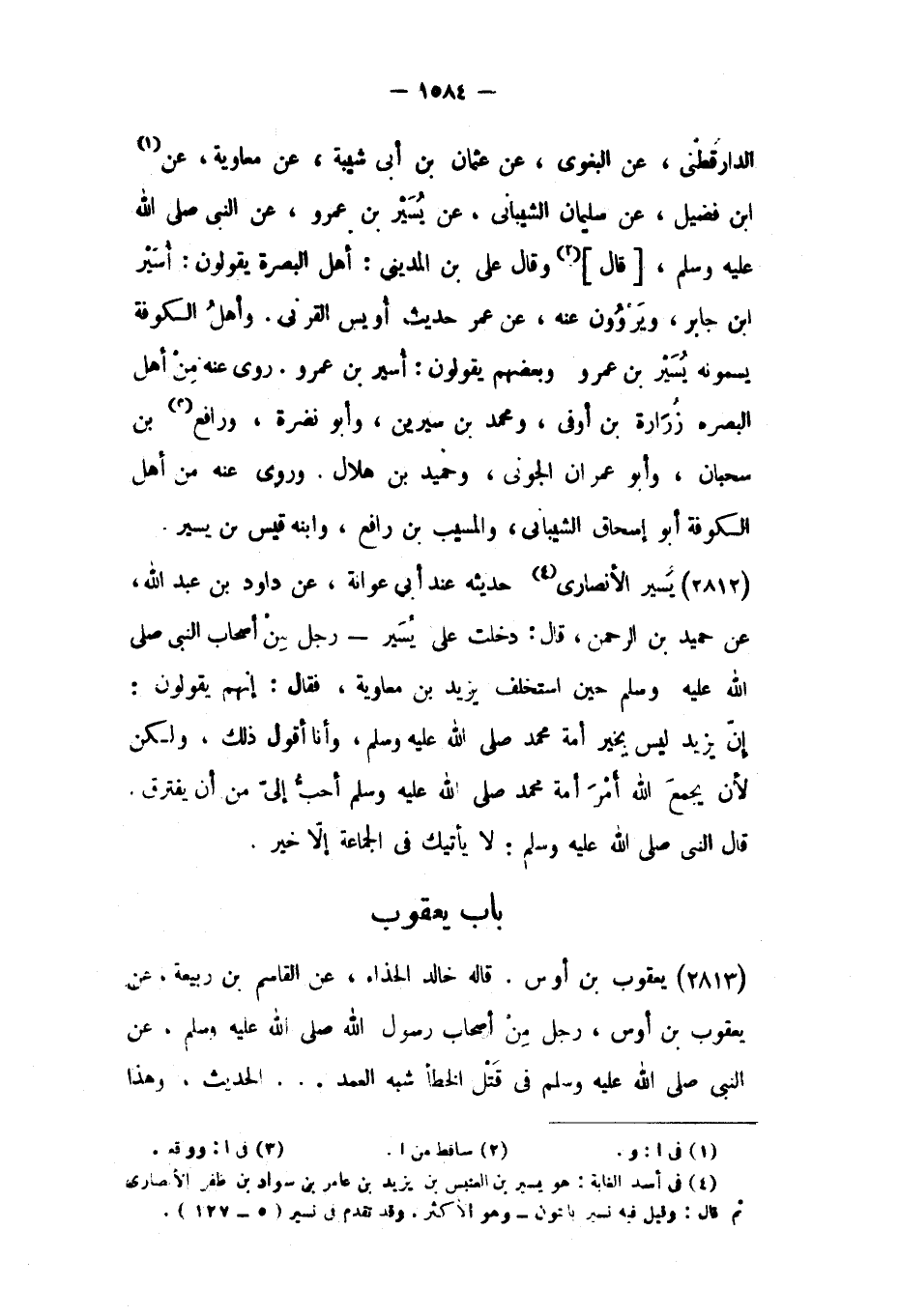 الدار قطنى، عَنِ البغوي، عَنْ عُثْمَان بْن أبي شيبة، عَنْ معاوية، عَنِ [١] ابْن فضيل، عَنْ سُلَيْمَان الشيباني، عَنْ يسير بْن عَمْرو، عَنِ النَّبِيّ صَلَّى اللَّهُ عَلَيْهِ وَسَلَّمَ، [قَالَ] [٢] وَقَالَ علي بن المديني: أهل البصرة يقولون: أسير ابن جابر، ويروون عنه، عَنْ عمر حديث أويس القرني. وأهل الكوفة يسمونه يسير بْن عَمْرو وبعضهم يقولون: أسير بْن عَمْرو. روى عنه من أهل البصرة زرارة بْن أوفى، ومحمد بْن سيرين، وأبو نضرة، ورافع [٣] بْن سحبان، وأبو عمران الجوني، وحميد بْن هلال. وروى عنه من أهل الكوفة أَبُو إِسْحَاق الشيباني، والمسيب بْن رافع، وابنه قيس بْن يسير.