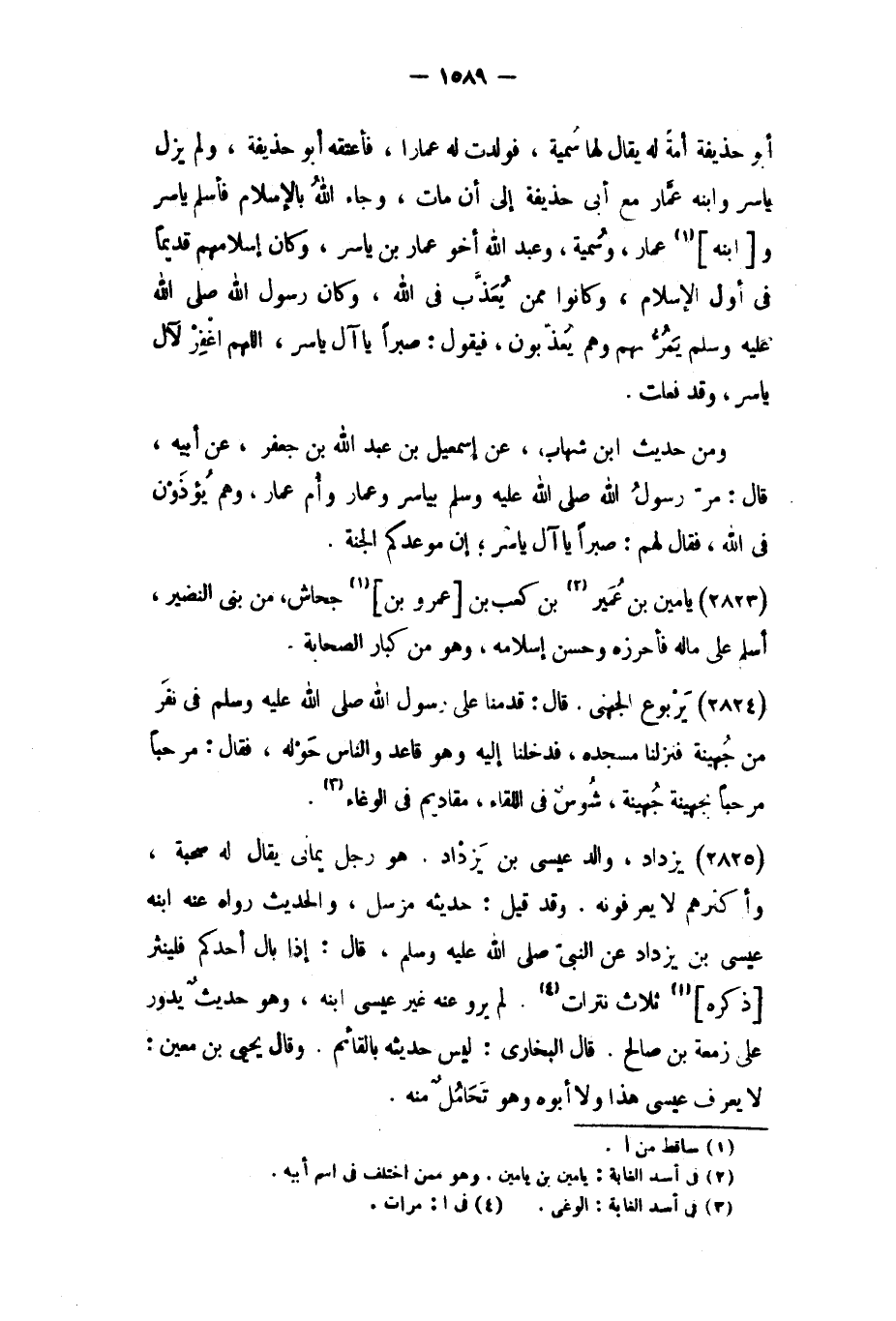 أبو حذيفة أمة له يقال لها سمية، فولدت له عمارًا، فأعتقه أَبُو حذيفة، ولم يزل ياسر وابنه عمار مَعَ أبي حذيفة إِلَى أن مات، وجاء اللَّه بالإسلام فأسلم ياسر و [ابنه] [١] عمار، وسمية، وعَبْد اللَّهِ أخو عمار بْن ياسر، وَكَانَ إسلامهم قديمًا فِي أول الإسلام، وكانوا ممن يعذب فِي اللَّه، وَكَانَ رَسُول اللَّهِ صَلَّى اللَّهُ عَلَيْهِ وَسَلَّمَ يمر بهم وهم يعذبون، فيقول: صبرًا يَا آل ياسر، اللَّهمّ اغفر لآل ياسر، وقد فعلت.