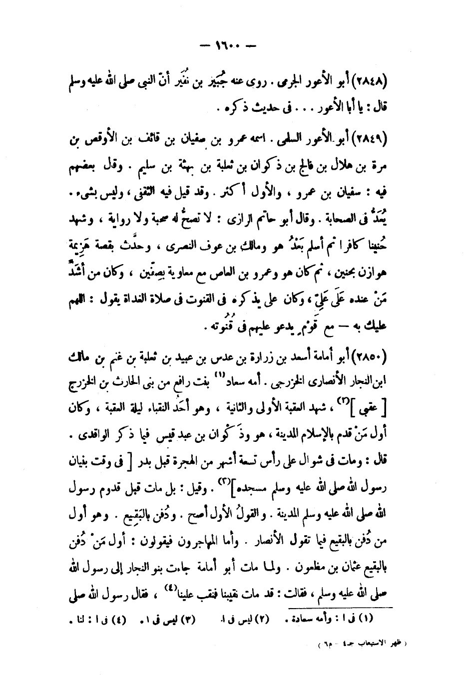 (٢٨٥٠) أَبُو أمامة أسعد بن زرارة بن عدس بن عبيد بن ثعلبة بن غنم بن مالك ابن النجار الأَنْصَارِيّ الخزرجي.