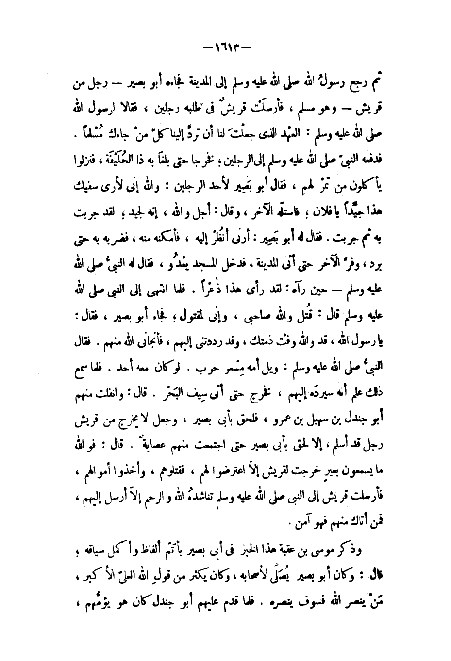 وذكر مُوسَى بْن عُقْبَةَ هَذَا الخبر فِي أبي بصير بأتم ألفاظ وأكمل سياقه، قَالَ: وَكَانَ أَبُو بصير يصلي لأصحابه، وَكَانَ يكثر من قول اللَّه العلي الأكبر، من ينصر اللَّه فسوف ينصره. فلما قدم عليهم أبو جندل كان هو يؤمّهم،