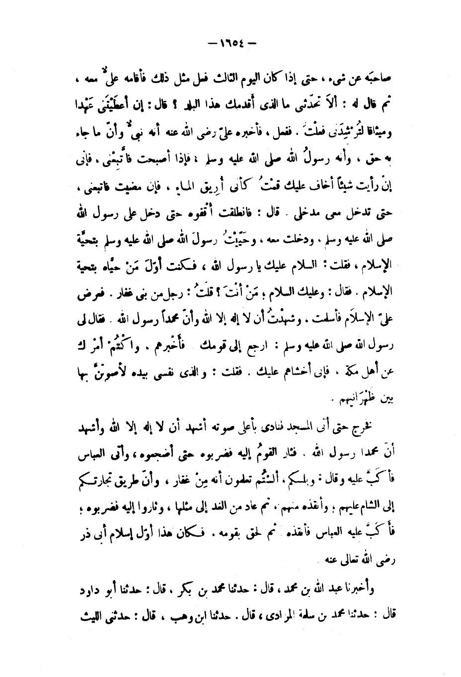 صَاحِبَهُ عَنْ شَيْءٍ، حَتَّى إِذَا كَانَ الْيَوْمُ الثَّالِثُ فَعَلَ مِثْلَ ذَلِكَ فَأَقَامَهُ عَلَيٌّ مَعَهُ، ثُمَّ قَالَ لَهُ: أَلا تُحَدِّثَنِي مَا الَّذِي أَقْدَمَكَ هَذَا الْبَلَدَ؟ قَالَ: إِنْ أَعْطَيْتَنِي عَهْدًا وَمِيثَاقًا لَتُرْشِدُنِي فَعَلْتُ. فَفَعَلَ، فَأَخْبَرَهُ عَلِيٌّ رَضِيَ اللَّهُ عَنْهُ أَنَّهُ نَبِيٌّ وَأَنَّ مَا جَاءَ بِهِ حَقٌّ، وَأَنَّهُ رَسُولُ اللَّهِ صَلَّى اللَّهُ عَلَيْهِ وَسَلَّمَ، فَإِذَا أَصْبَحْتَ فَاتْبَعْنِي، فَإِنِّي إِنْ رَأَيْتُ شَيْئًا أَخَافُ عَلَيْكَ قُمْتُ كَأَنِّي أُرِيقُ الْمَاءَ، فَإِنْ مَضَيْتُ فَاتْبَعْنِي، حَتَّى تَدْخُلَ مَعِي مُدْخَلِي. قَالَ: فَانْطَلَقْتُ أَقْفُوهُ حَتَّى دَخَلَ عَلَى رَسُولُ اللَّهِ صَلَّى اللَّهُ عَلَيْهِ وَسَلَّمَ، وَدَخَلْتُ مَعَهُ، وَحَيَّيْتُ رَسُولَ اللَّهِ صَلَّى اللَّهُ عَلَيْهِ وَسَلَّمَ بِتَحِيَّةِ الإِسْلامِ، فَقُلْتُ: السَّلامُ عَلَيْكَ يَا رَسُولَ اللَّهِ، فَكُنْتُ أَوَّلُ مَنْ حَيَّاهُ بِتَحِيَّةِ الإِسْلامِ. فَقَالَ: وَعَلَيْكَ السَّلامُ، مَنْ أَنْتَ؟ قُلْتُ: رَجُلٌ مِنْ بَنِي غِفَارٍ. فَعَرَضَ عَلَيَّ الإِسْلامَ فَأَسْلَمْتُ، وَشَهِدْتُ أَنْ لا إِلَهَ إِلا اللَّهُ وَأَنَّ مُحَمَّدًا رَسُولُ اللَّهِ. فَقَالَ لِي رَسُولُ اللَّهِ صَلَّى اللَّهُ عَلَيْهِ وَسَلَّمَ: ارْجِعْ إِلَى قَوْمِكَ فَأَخْبِرْهُمْ، وَاكْتُمْ أَمْرَكَ عَنْ أَهْلِ مَكَّةَ، فَإِنِّي أَخْشَاهُمْ عَلَيْكَ. فَقُلْتُ: وَالَّذِي نَفْسِي بِيَدِهِ لأُصَوِّتَنَّ بِهَا بَيْنَ ظَهْرَانِيهِمْ. فَخَرَجَ حَتَّى أَتَى الْمَسْجِدَ فَنَادَى بِأَعْلَى صَوْتِهِ أَشْهَدُ أَنْ لا إله إلا الله وأشهد أن محمدا رسول اللَّهِ. فَثَارَ الْقَوْمُ إِلَيْهِ فَضَرَبُوهُ حَتَّى أَضْجَعُوهُ، وَأَتَى الْعَبَّاسُ فَأَكَبَّ عَلَيْهِ وَقَالَ: وَيْلَكُمْ، أَلَسْتُمْ تَعْلَمُونَ أَنَّهُ مِنْ غِفَارٍ، وَأَنَّ طَرِيقَ تِجَارَتِكُمْ إِلَى الشَّامِ عَلَيْهِمْ، وَأَنْقَذَهُ مِنْهُمْ، ثُمَّ عَادَ مِنَ الْغَدِ إِلَى مِثْلِهَا، وَثَارُوا إِلَيْهِ فَضَرَبُوهُ، فَأَكَبَّ عَلَيْهِ الْعَبَّاسُ فَأَنْقَذَهُ ثُمَّ لَحِقَ بِقَوْمِهِ، فَكَانَ هَذَا أَوَّلُ إِسْلامِ أَبِي ذَرٍّ رَضِيَ اللَّهُ تَعَالَى عَنْهُ.