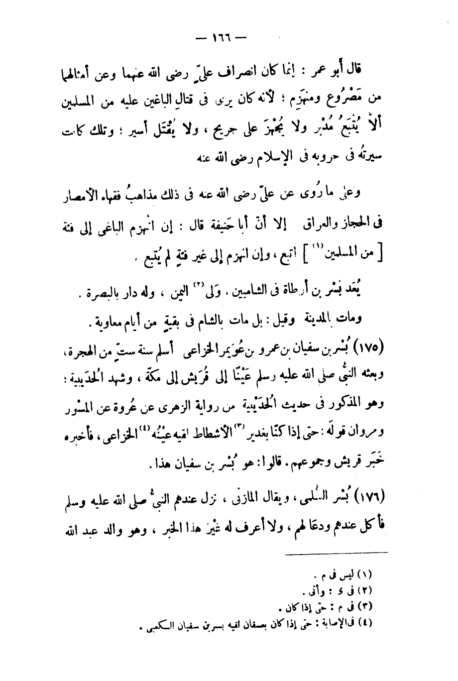 قَالَ أبو عمر: إنما كان انصراف علي رضي الله عنهما وعن أمثالهما من مصروع ومنهزم، لأنه كان يرى في قتال الباغين عليه من المسلمين ألا يتبع مدبر ولا يجهز على جريح، ولا يقتل أسير، وتلك كانت سيرته في حروبه في الإسلام رضي الله عنه.