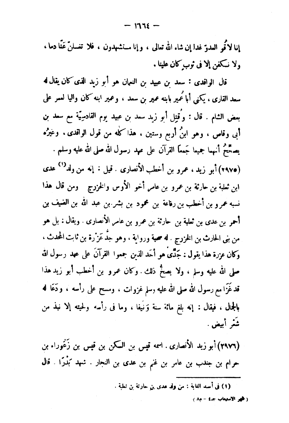 قَالَ الْوَاقِدِيّ: سعد بْن عبيد بْن النعمان هُوَ أَبُو زيد الَّذِي كَانَ يقال له سعد القاري، يكنى أبا عمير بابنه عمير بْن سعد، وعمير ابنه كَانَ واليًا لعمر عَلَى بعض الشام. قَالَ: وقتل أَبُو زيد سعد بْن عبيد يوم القادسية مَعَ سعد بْن أبي وقاص، وَهُوَ ابْن أربع وستين، هَذَا كله من قول الْوَاقِدِيّ، وغيره يصحح أنهما جميعا جمعا القرآن على عهد رسول الله صلى الله عَلَيْهِ وسلم.