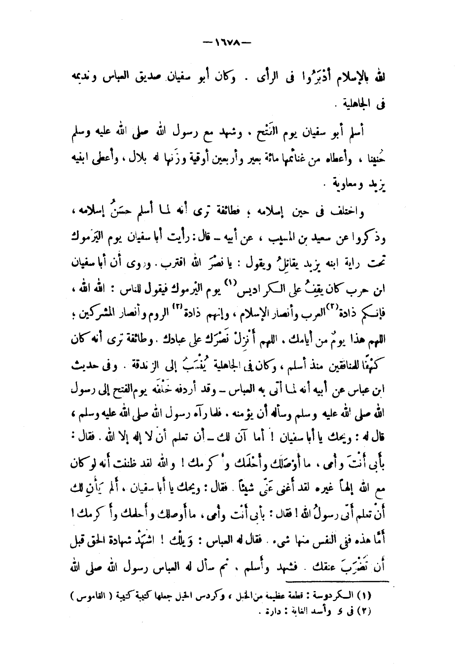 واختلف في حين إسلامه، فطائفة ترى أنه لما أسلم حسن إسلامه، وذكروا عَنْ سَعِيد بْن المسيب، عَنْ أبيه- قَالَ: رأيت أبا سُفْيَان يوم اليرموك تحت راية ابنه يَزِيد يقاتل ويقول: يَا نصر اللَّه اقترب. وروى أن أبا سُفْيَان ابْن حرب كَانَ يقف عَلَى الكراديس [١] يوم اليرموك فيقول للناس: اللَّه اللَّه، فإنكم ذادة [٢] العرب وأنصار الإسلام، وإنهم ذادة [٢] الروم وأنصار المشركين، اللَّهمّ هَذَا يوم من أيامك، اللَّهمّ أنزل نصرك عَلَى عبادك. وطائفة ترى أنه كَانَ كهفًا للمنافقين منذ أسلم، وَكَانَ فِي الجاهلية ينسب إِلَى الزندقة. وفي حديث ابْن عباس عَنْ أبيه أنه لما أتى به العباس- وقد أردفه خلفه يوم الفتح إِلَى رَسُول اللَّهِ صَلَّى اللَّهُ عَلَيْهِ وَسَلَّمَ وسأله أن يؤمنه. فلما رآه رَسُول اللَّهِ صَلَّى اللَّهُ عَلَيْهِ وَسَلَّمَ، قَالَ له: ويحك يَا أبا سُفْيَان! أما آن لك- أن تعلم أن لا اله إلا اللَّه. فَقَالَ:
