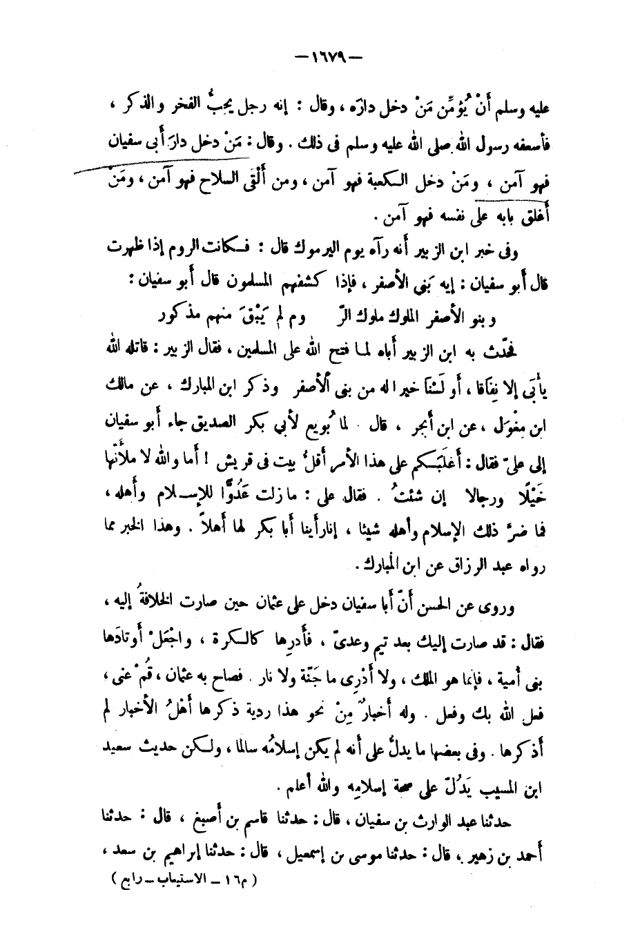 فحدث به ابْن الزُّبَيْر أباه لما فتح اللَّه عَلَى المسلمين، فَقَالَ الزُّبَيْر: قاتله الله يأبى إلا نفاقا، أو لسنا خيرًا له من بني الأصفر وَذَكَرَ ابْنُ المبارك، عن مالك ابن مِغْوَلٍ، عَنِ ابْنِ أَبْجَرَ، قَالَ. لَمَّا بُويِعَ لأَبِي بَكْرٍ الصِّدِّيقِ جَاءَ أَبُو سُفْيَانَ إِلَى عَلِيٍّ فَقَالَ: أَغْلَبَكُمْ عَلَى هَذَا الأَمْرِ أَقَلُّ بَيْتٍ فِي قُرَيْشٍ! أَمَا وَاللَّهِ لأَمْلأَنَّهَا خَيْلا وَرِجَالا إِنْ شِئْتَ. فَقَالَ عَلِيٌّ: مَا زِلْتُ عَدُوًّا لِلإِسْلامِ وَأَهْلِهِ، فَمَا ضَرَّ ذَلِكَ الإِسْلامَ وَأَهْلَهُ شَيْئًا، إِنَّا رَأَيْنَا أَبَا بَكْرٍ لَهَا أهلا. وهذا الخبر مما رواه عبد الرزاق عَنِ ابْنِ الْمُبَارَكِ. وروي عَنِ الحسن أن أبا سُفْيَان دخل عَلَى عُثْمَان حين صارت الخلافة إِلَيْهِ، فَقَالَ: قد صارت إليك بعد تيم وعدي، فأدرها كالكرة، واجعل أوتادها بني أمية، فإنما هُوَ الملك، ولا أدري مَا جنة ولا نار. فصاح به عُثْمَان، قم عني، فعل اللَّه بك وفعل. وله أخبار من نحو هَذَا ردية ذكرها أهل الأخبار لم أذكرها. وفي بعضها مَا يدل عَلَى أنه لم يكن إسلامه سالمًا، ولكن حديث سعيد ابن المسيب يدل عَلَى صحة إسلامه والله أعلم.
