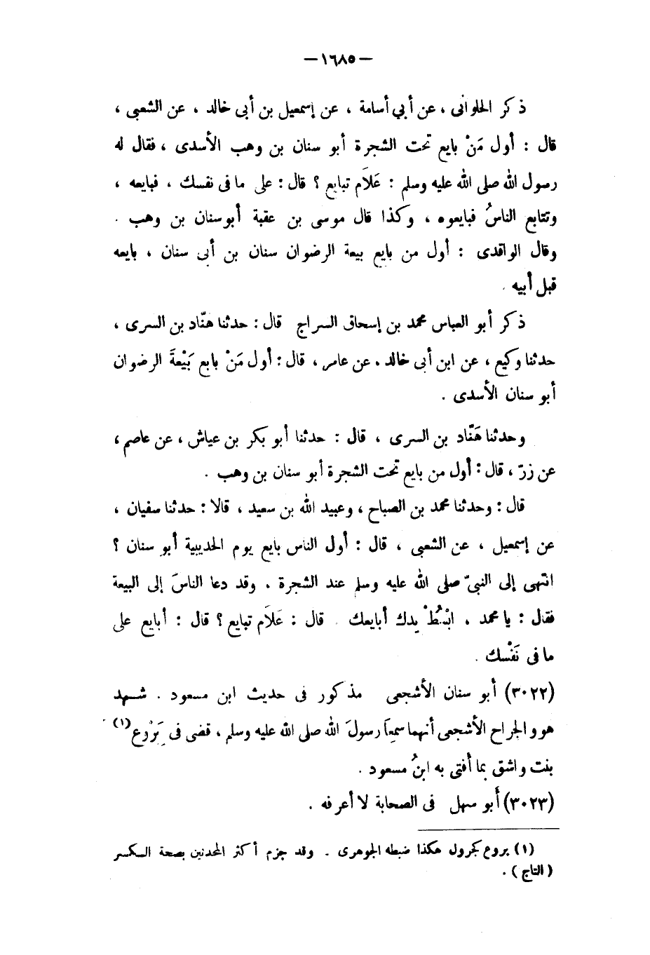 قَالَ: وَحَدَّثَنَا مُحَمَّدُ بْنُ الصَّبَّاحِ، وَعُبَيْدُ اللَّهِ بْنُ سَعِيدٍ، قالا: حَدَّثَنَا سُفْيَانُ، عَنْ إِسْمَاعِيلَ، عَنِ الشَّعْبِيِّ، قَالَ: أَوَّلُ النَّاسِ بَايَعَ يَوْمَ الْحُدَيْبِيَةِ أَبُو سِنَانٍ؟
