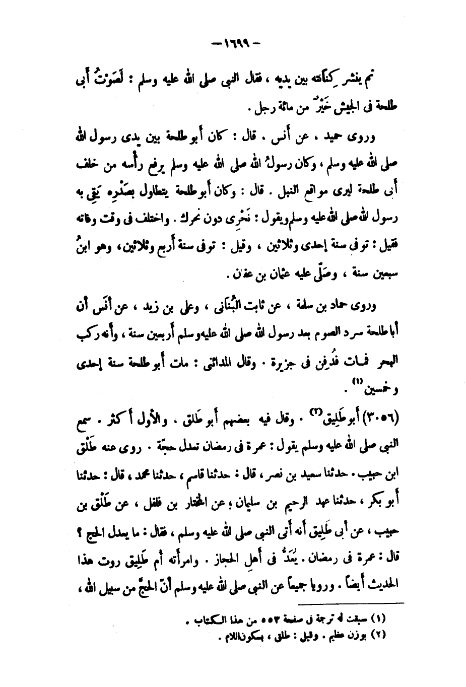 وَقَالَ فيه بعضهم أَبُو طلق. والأول أكثر. سمع النَّبِيّ صَلَّى اللَّهُ عَلَيْهِ وَسَلَّمَ يقول: عمرة فِي رمضان تعدل حجة. روى عنه طلق ابن حبيب. حَدَّثَنَا سَعِيدُ بْنُ نَصْرٍ، قَالَ: حَدَّثَنَا قَاسِمٌ، حَدَّثَنَا مُحَمَّدٌ، قَالَ: حَدَّثَنَا أَبُو بَكْرٍ، حَدَّثَنَا عَبْدُ الرَّحِيمِ بْنُ سُلَيْمَانَ، عَنِ الْمُخْتَارِ بْنِ فُلْفُلٍ، عَنْ طَلْقِ بْنِ حَبِيبٍ، عَنْ أَبِي طَلِيقٍ أَنَّهُ أَتَى النَّبِيَّ صَلَّى اللَّهُ عَلَيْهِ وَسَلَّمَ، فَقَالَ: مَا يَعْدِلُ الْحَجَّ؟