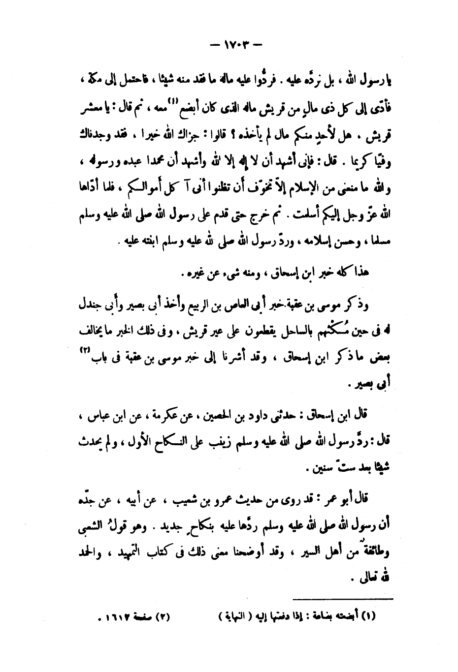 قَالَ أَبُو عُمَرَ: قَدْ رُوِيَ مِنْ حَدِيثِ عَمْرِو بن شعيب، عن أبيه، عن جده أن رَسُولَ اللَّهِ صَلَّى اللَّهُ عَلَيْهِ وَسَلَّمَ رَدَّهَا عَلَيْهِ بِنِكَاحٍ جَدِيدٍ. وَهُوَ قَوْلُ الشَّعْبِيِّ وَطَائِفَةٍ من أَهْلِ السِّيَرِ، وَقَدْ أَوْضَحْنَا مَعْنَى ذَلِكَ فِي كتاب التمهيد، والحمد للَّه تعالى.