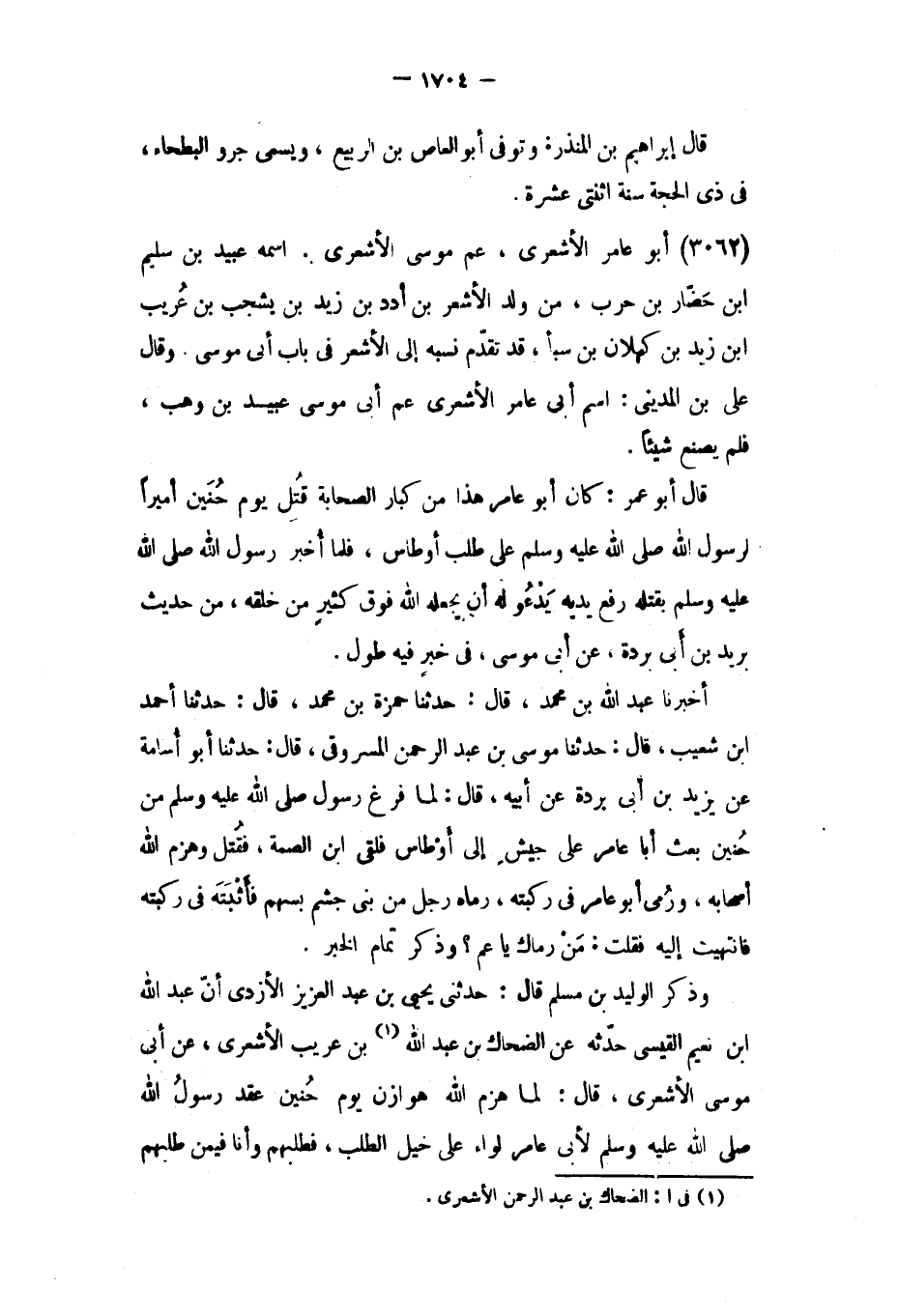 وَذَكَرَ الْوَلِيدُ بْنُ مُسْلِمٍ قَالَ: حَدَّثَنِي يَحْيَى بْنُ عَبْدِ الْعَزِيزِ الأَزْدِيُّ أَنَّ عَبْدَ اللَّهِ ابْنَ نُعَيْمٍ الْقَيْسِيّ حَدَّثَهُ عَنِ الضَّحَّاكِ بْنِ عَبْدِ اللَّهِ [١] بْنِ عَرِيبٍ الأَشْعَرِيِّ، عَنْ أَبِي مُوسَى الأَشْعَرِيِّ، قَالَ: لَمَّا هَزَمَ اللَّهُ هَوَازِنَ يَوْمَ حُنَيْنٍ عَقَدَ رَسُولُ اللَّهِ صَلَّى اللَّهُ عَلَيْهِ وَسَلَّمَ لأَبِي عَامِرٍ لِوَاءً عَلَى خَيْلِ الطَّلَبِ، فَطَلَبَهُمْ وأنا فيمن طلبهم