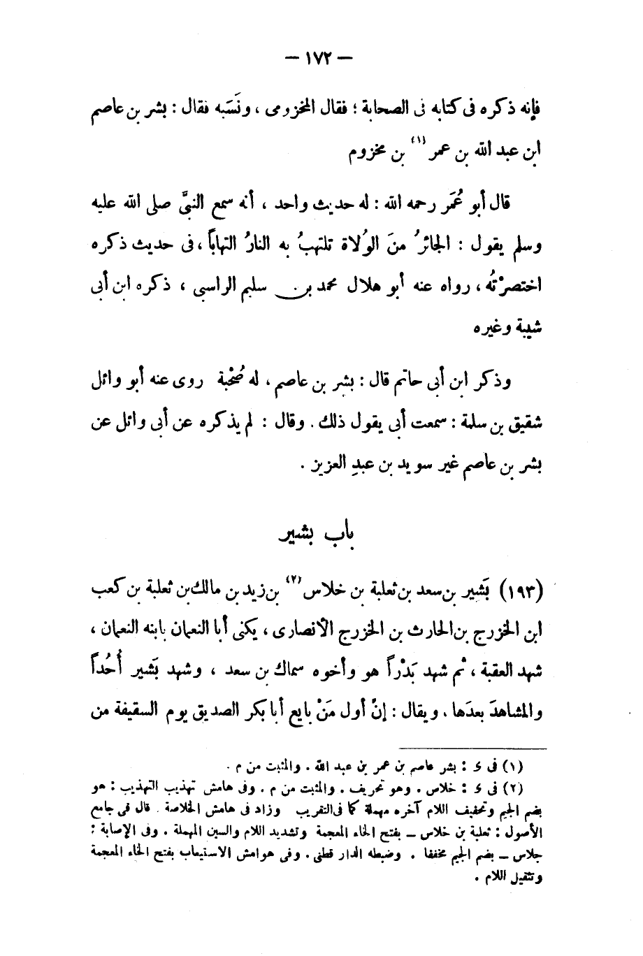 فإنه ذكره في كتابه في الصحابة، فقال المخزومي، ونسبه فقال: بشر بن عاصم ابن عَبْد الله بن عمر [١] بن مخزوم قَالَ أبو عمر رحمه الله: له حديث واحد، أنه سمع النبي صلى الله عليه وسلم يقول: الجائر من الولاة تلتهب به النار التهابًا، في حديث ذكره اختصرته، رواه عنه أبو هلال مُحَمَّد بن سليم الراسبي، ذكره ابن أبي شيبة وغيره.