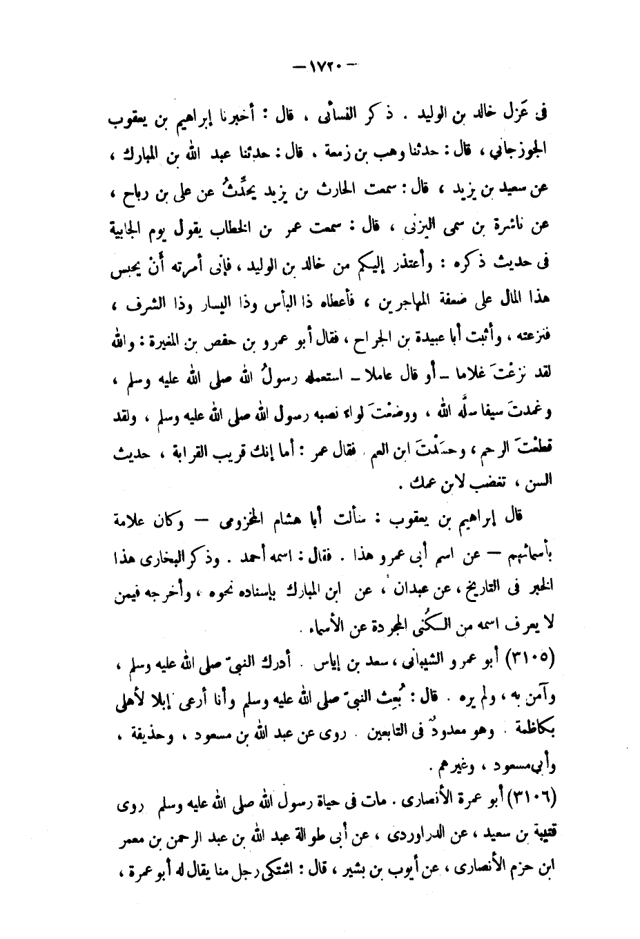 فِي عَزْلِ خَالِدِ بْنِ الْوَلِيدِ. ذَكَرَ النَّسَائِيُّ، قَالَ: أَخْبَرَنَا إِبْرَاهِيمُ بْنُ يَعْقُوبَ الْجُوزَجَانِيُّ، قَالَ: حَدَّثَنَا وَهْبُ بْنُ زَمْعَةَ، قَالَ: حَدَّثَنَا عَبْدُ اللَّهِ بْنُ الْمُبَارَكِ، عَنْ سَعِيدِ بْنِ يَزِيدَ، قَالَ: سَمِعْتُ الْحَارِثَ بْنَ يَزِيدَ يُحَدِّثُ عَنْ عَلِيِّ بْنِ رَبَاحٍ، عَنْ نَاشِرَةَ بْنِ سُمَيٍّ الْيَزَنِيِّ، قَالَ: سَمِعْتُ عُمَرَ بْنَ الْخَطَّابِ يَقُولُ يَوْمَ الْجَابِيَةِ فِي حَدِيثٍ ذَكَرَهُ: وَأَعْتَذِرُ إِلَيْكُمْ مِنْ خَالِدِ بْنِ الْوَلِيدِ، فَإِنِّي أَمَرْتُهُ أَنْ يَحْبِسَ هَذَا الْمَالَ عَلَى ضَعَفَةِ الْمُهَاجِرِينَ، فَأَعْطَاهُ ذَا الْبَأْسِ وَذَا الْيَسَارِ وَذَا الشَّرَفِ، فَنَزَعْتُهُ، وَأُثَبِّتُ أَبَا عُبَيْدَةَ بْنَ الْجَرَّاحِ، فَقَالَ أَبُو عَمْرِو بْنُ حَفْصِ بْنِ الْمُغِيرَةِ: وَاللَّهِ لَقَدْ نَزَعْتَ غُلامًا- أَوْ قَالَ عَامِلا- اسْتَعْمَلَهُ رَسُولُ اللَّهِ صَلَّى اللَّهُ عَلَيْهِ وَسَلَّمَ، وَغَمَدْتَ سَيْفًا سَلَّهُ اللَّهُ، وَوَضَعْتَ لِوَاءً نَصَبَهُ رَسُولُ اللَّهِ صَلَّى اللَّهُ عَلَيْهِ وَسَلَّمَ، وَلَقَدْ قَطَعْتَ الرَّحِمَ، وَحَسَدْتَ ابْنَ الْعَمِّ. فَقَالَ عُمَرُ: أَمَا إِنَّكَ قَرِيبُ الْقَرَابَةِ، حَدِيثُ السِّنِّ، تَغْضَبُ لابْنِ عَمِّكَ.