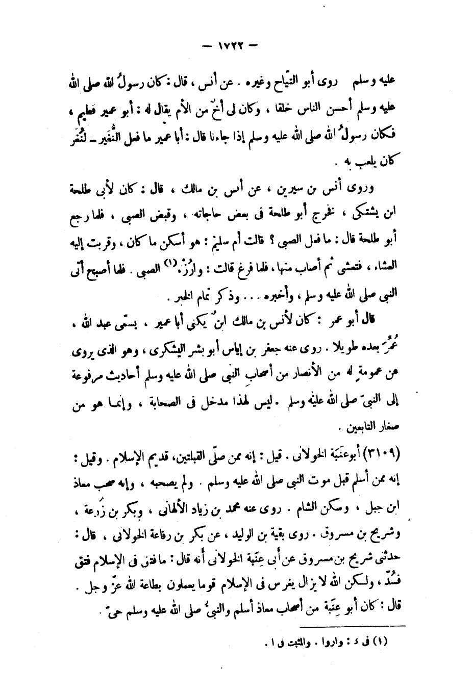 عَلَيْهِ وَسَلَّمَ روى أَبُو التياح وغيره. عَنْ أنس، قال: كان رسول الله صلى الله عَلَيْهِ وَسَلَّمَ أحسن الناس خلقًا، وَكَانَ لي أخ من الأم يقال له: أَبُو عمير فطيم، فكان رَسُول اللَّهِ صَلَّى اللَّهُ عَلَيْهِ وَسَلَّمَ إذا جاءنا قَالَ: أبا عمير مَا فعل النغير- لنغر كَانَ يلعب به. وروى أنس بْن سيرين، عَنْ أنس بْن مالك، قَالَ: كَانَ لأبي طلحة ابْن يشتكي، فخرج أَبُو طلحة فِي بعض حاجاته، وقبض الصبي، فلما رجع أَبُو طلحة قَالَ: مَا فعل الصبي؟ قالت أم سليم: هُوَ أسكن مَا كَانَ، وقربت إليه العشاء، فتعشى ثم أصاب منها، فلما فرغ قالت: وارزء [١] الصبي. فلما أصبح أتى النَّبِيّ صَلَّى اللَّهُ عَلَيْهِ وَسَلَّمَ، وأخبره ... وذكر تمام الخبر.