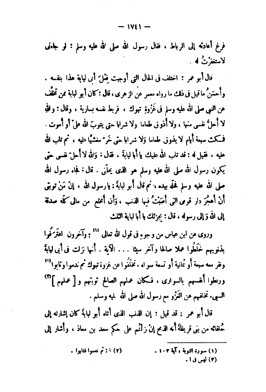 فمكث سبعة أيام لا يذوق طعاما ولا شرابًا حَتَّى خر مغشيًا عَلَيْهِ، ثم تاب اللَّه عَلَيْهِ، فقيل له: قد تاب اللَّه عليك يَا أبا لبابة، فَقَالَ: والله لا أحل نفسي حَتَّى يكون رَسُول اللَّهِ صَلَّى اللَّهُ عَلَيْهِ وَسَلَّمَ هُوَ الَّذِي يحلني. قَالَ: فجاء رسول الله صلى الله عليه وسلم فحله بيده، ثم قَالَ أَبُو لبابة: يَا رَسُولَ اللَّهِ، إن من توبتي أن أهجر دار قومي التي أصبت فِيهَا الذنب، وأن أنخلع من مالي كله صدقة إِلَى اللَّه وإلى رسوله، قَالَ: يجزئك يَا أبا لبابة الثلث. وروى عَنِ ابْن عباس من وجوه فِي قول اللَّه تعالى [١] : وَآخَرُونَ اعْتَرَفُوا بِذُنُوبِهِمْ خَلَطُوا عَمَلًا صالِحاً وَآخَرَ سَيِّئاً ... ٩: ١٠٢ الآية. أنها نزلت فِي أبي لبابة ونفر معه سبعة أَوْ ثمانية أَوْ تسعة سواه، تخلفوا عَنْ غزوة تبوك ثم ندموا وتابوا [٢] وربطوا أنفسهم بالسواري، فكان عملهم الصالح توبتهم و [عملهم] [٣] السيّئ تخلفهم عَنِ الغزو مَعَ رَسُول اللَّهِ صَلَّى الله عليه وسلم.